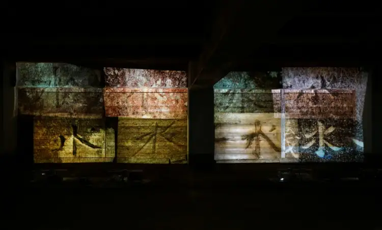 本展は、ミュージアムショップの奥にある秘密の入口をくぐった先にある真っ暗な空間が会場となる。4ヶ月にわたる市原でのフィールドワークをベースに、自然の移ろいとともに太古から流れてきた時間を遡った映像インスタレーションが展開される。