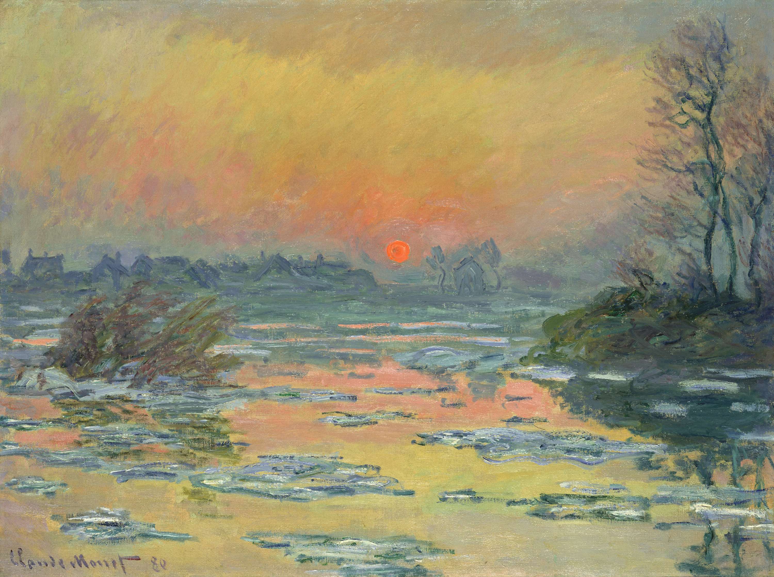 例えば厳冬のヴェトゥイユで解氷するセーヌ河を描いた《セーヌ河の日没、冬》(1880)とフェリックス・ゴンザレス=トレスの《「無題」(マルセル・ブリアンの肖像)》(1992)をあわせて展示。前者は、最愛の妻カミーユを失い深い悲しみに沈んでいたモネの喪失の感情がそこに映し出されている。いっぽう後者を構成する無数のキャンディの総重量は、作家の亡くなった恋人や家族、身近な人々の体重などに等しく、鑑賞者はそれを持ち帰ることができる。