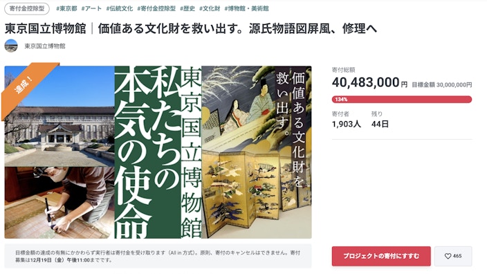取り壊し間近の民家で発見された伝 土佐光孚筆《源氏物語図屏風》 (江戸時代、19世紀)を修理するための、東京国立博物館によるクラウドファンディングが3000万円の目標金額を達成した。