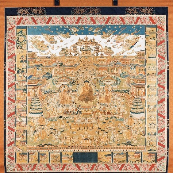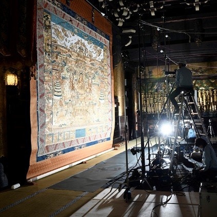 4.12×3.99mにおよぶ刺繡でつくられた《刺繡當麻曼荼羅(ししゅうたいままんだら)》は、京都・真正極楽寺が所蔵する仏画だ。そしてこのたび真正極楽寺、独立行政法人国立文化財機構奈良国立博物館、凸版印刷株式会社が協働し、本作を高精細デジタル撮影。微細な凹凸の質感をとらえるデジタルアーカイブを実現した。