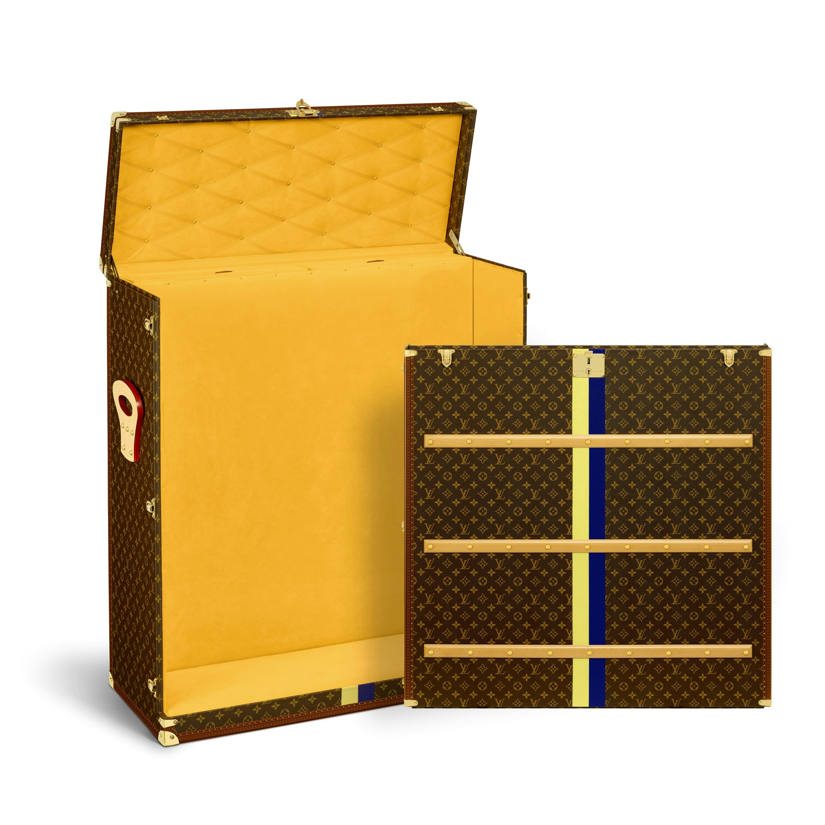 この実績を受け、アムステルダム国立美術館は《牛乳を注ぐ女》をアムステルダムから日本まで運搬するためにトランク製作を依頼。フランス・アニエールにあるルイ・ヴィトンのアトリエで、熟練した職人によって製作された。トランクはアイコニックなモノグラム・キャンバスに、メゾンを代表する真鍮のコーナー金具と錠前が付いており、外装には手作業によるストライプのペインティングが、ライニングには鮮やかなイエローが施されている。
