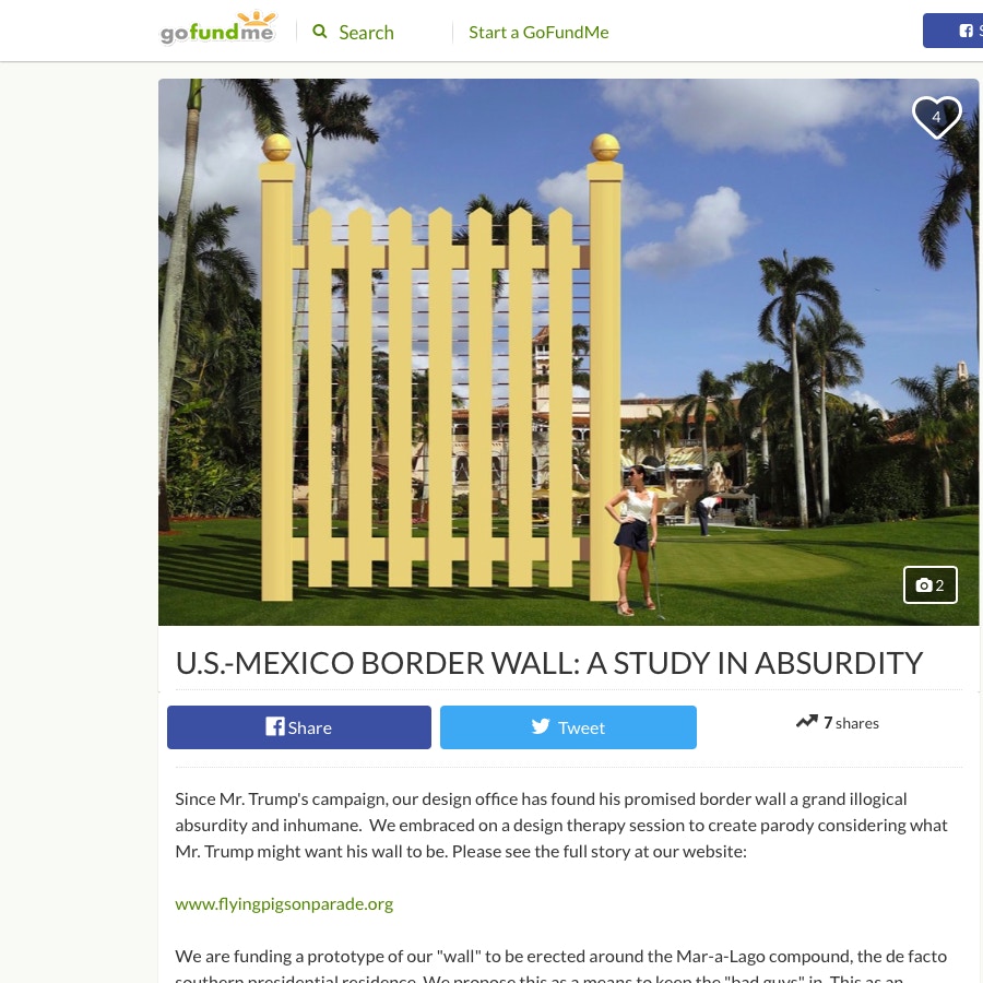 こうしたなか、New World Designは、マー・ア・ラゴの周りやメキシコとの国境に「壁」を建てるキャンペーンをアメリカのクラウドファンディングサイト「GoFundMe」で立ち上げた。しかし、目標金額は5億7000万ドル(約625億円)という非現実的な数字となっており、そもそもマー・ア・ラゴの周りに柵を立ち上げるのも現実的ではない。それゆえ、本プロジェクトが実現されなかった場合には、すべての出資金は国際難民支援プログラムに寄付されるという。