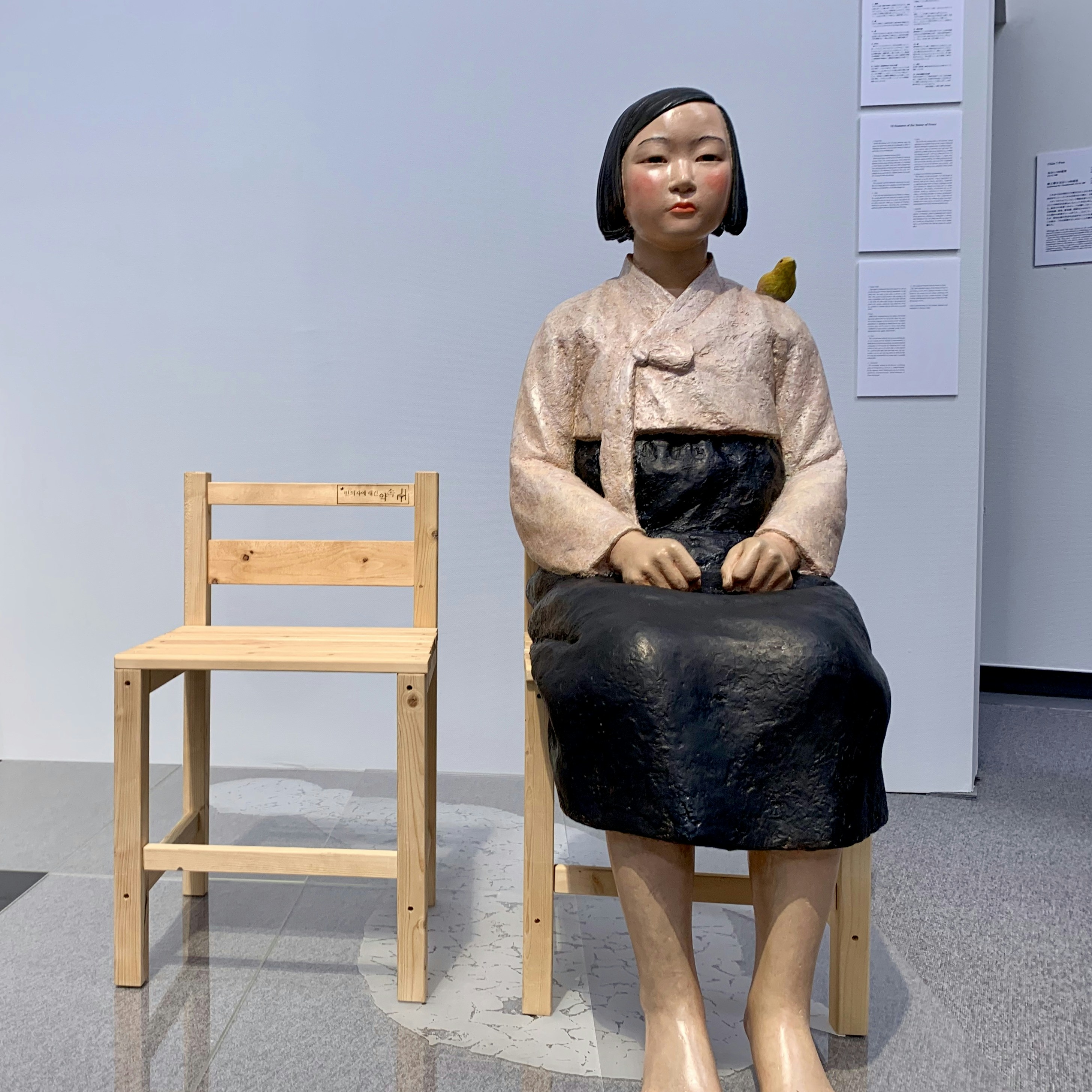 その一部である《平和の少女像》(2011)は、「『慰安婦』被害者の人権と名誉を回復するため在韓日本大使館前で20年続いてきた水曜デモ1000回を記念し、当事者の意志と女性の人権の闘いを称え継承する追悼碑として市民団体が構想し市民の募金で建てられた」(会場キャプションより)もの。現在では韓国国内の複数ヶ所に加え、韓国国外でも設置されている。