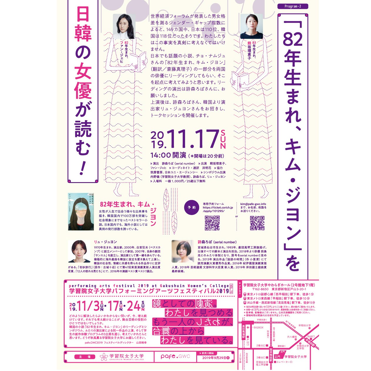 本企画は、チョ・ナムジュによるベストセラー小説『82年生まれ、キム・ジヨン』(2016)のリーディングをベースとしたシンポジウム。同著は、33歳の主婦の半生を通じ、韓国の女性なら誰もが経験するような男女の不平等や苦悩を描いたもので、韓国国内で100万部を突破し、社会現象にもなった。日本においても、2018年に斎藤真理子によって訳されたものが筑摩書房より刊行され、注目を集めた。