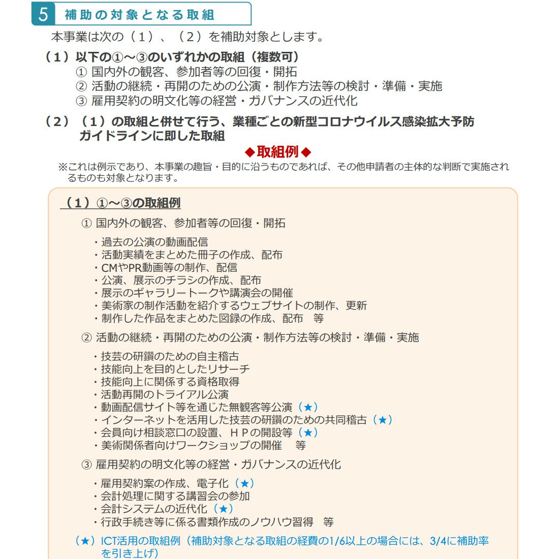 補助対象として認められるのは、今年2月26日から来年2月28日までの事業に発生した経費となる。対象となるのは、直近3年間(2017年度以降)2回以上の文化芸術活動を行う、フリーランスを含む個人または文化芸術団体。