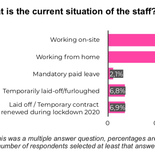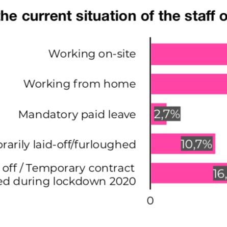 フリーランスのスタッフの状況は前回より改善しているが、依然として憂慮すべき状態にある。回答者の11パーセント近くは一時的に解雇され、16パーセントは契約を更新されていない。また、28.9パーセントの回答者は失業の恐れがあると答えており、27.5パーセントはキャリアの全面的な変更を検討しているという。
