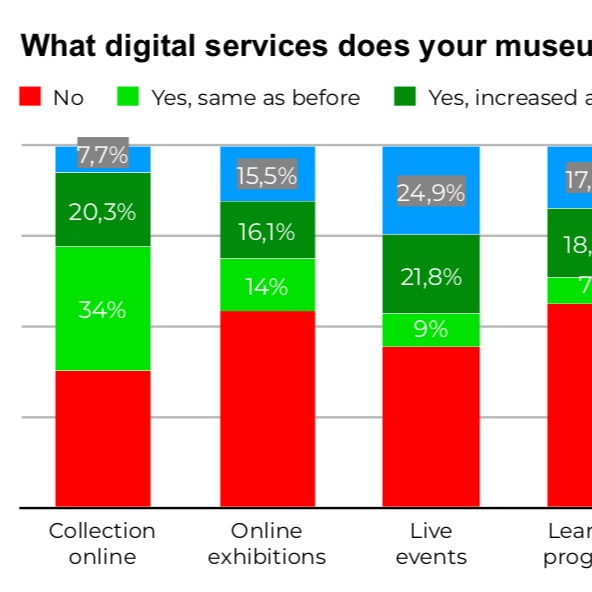 コロナ禍での大きな変化として挙げられるのが、美術館のデジタルプログラムの強化だ。オンライン展覧会やライブストリーミング・イベント、ラーニング・プログラム、ニュースレター、SNSなどのカテゴリーにおいては、平均31.7パーセントの美術館がロックダウンのなかでデジタルプログラムを開始もしくは増加したことが示された。
