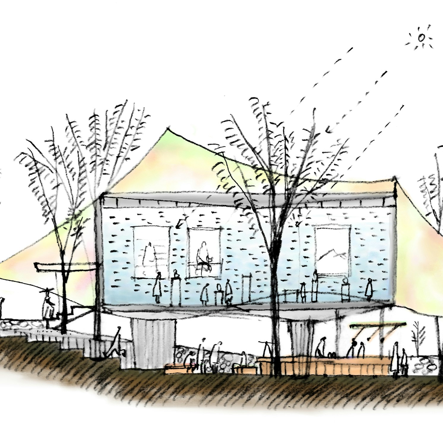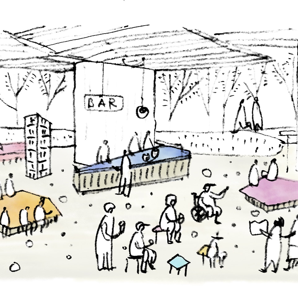 ピロティは、来場者との対話を通じてともに考える事ができる半屋外空間として機能。建築家・家成俊勝が代表を務めるdot architectsがこの場所を担当する。バーをしつらえ、居心地よく人々が集まり、語り合う場を作り出すという。このバーでは定期的にトークイベントを実施し、建築家、施工者、運営者、地域の使い手や研究者などが参加する計画だ。