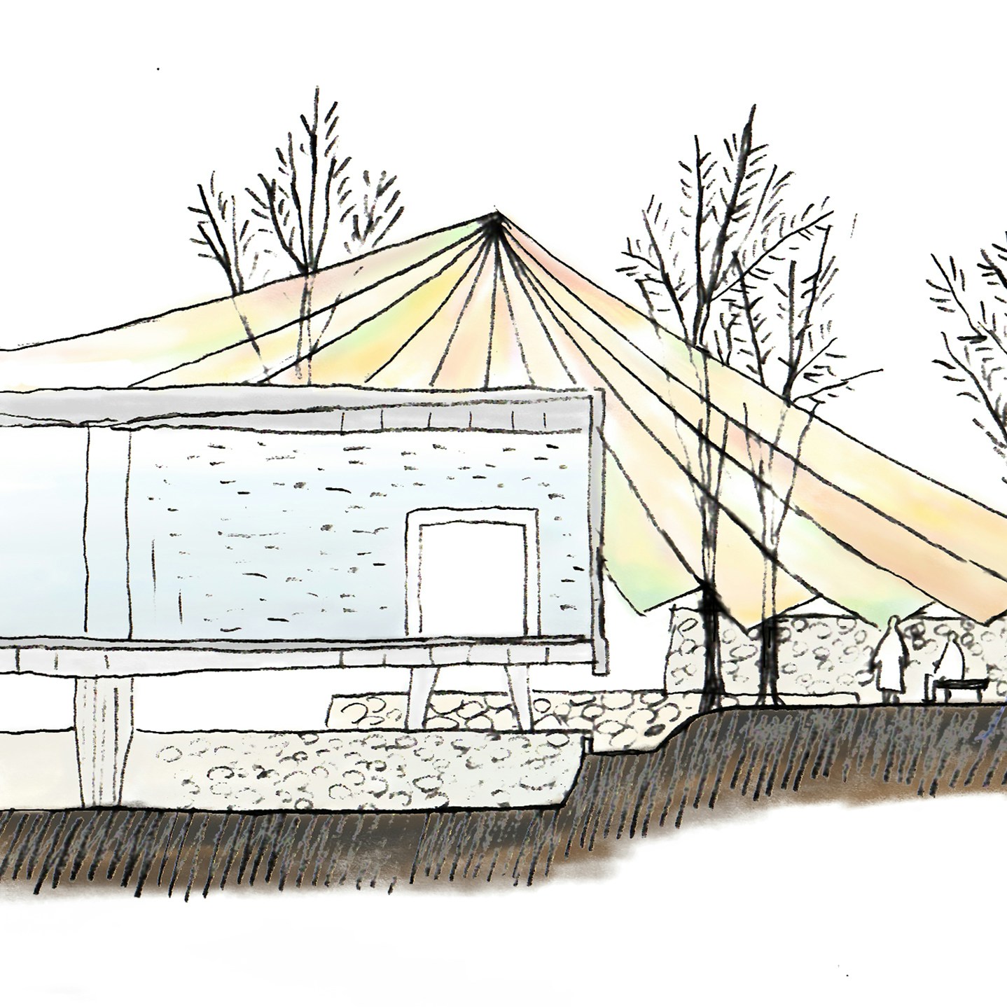 外観はやわらかさや生命を感じさせる佇まいを重視し、吉阪による日本館にテキスタイルのマントを着せて、思わず近寄りたくなるものに変化させるという。このテキスタイルはテキスタイルデザイナー/アーティストの森山茜が担当。繊維をつくる過程から福祉施設との対話のなかでつくられ、会期終了後はほかの用途に転用される予定だ。