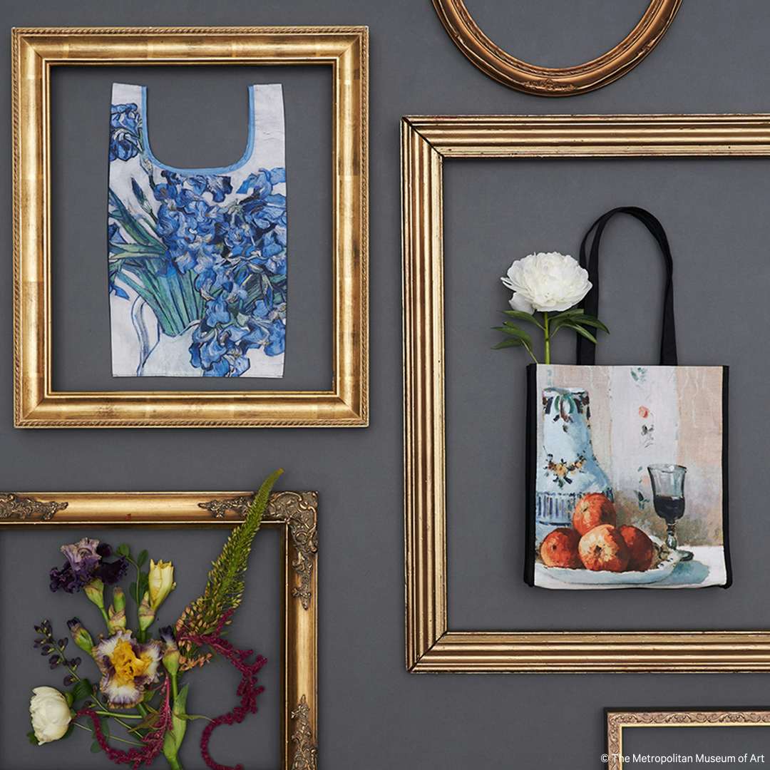 商品のラインナップは、ゴッホの筆致が楽しめる《Irises》のタペストリー、ピサロの《Still Life with Apples and Pitcher》を大胆にトリミングしたキャンバストートバッグ、セザンヌが描いたりんごを身に纏うことができるプリントロングTシャツ、ティーカップに猫が覗く「TEA PARTY」の図柄のブックマーカーやチャームセットなど様々。