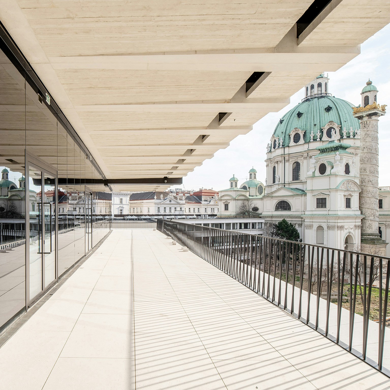 既存の建物の上に浮かぶようなかたちで増築された4階(通称、「フローティング・フロア」)は、企画展会場として利用される予定。フローティング・フロアと既存の建物のあいだには一般開放のテラスも設けられ、1739年に完成したバロック様式のカール教会を眼前にした眺望を楽しむことができる。またテラスには、カフェとイベントスペース、瞑想スタジオも併設される。
