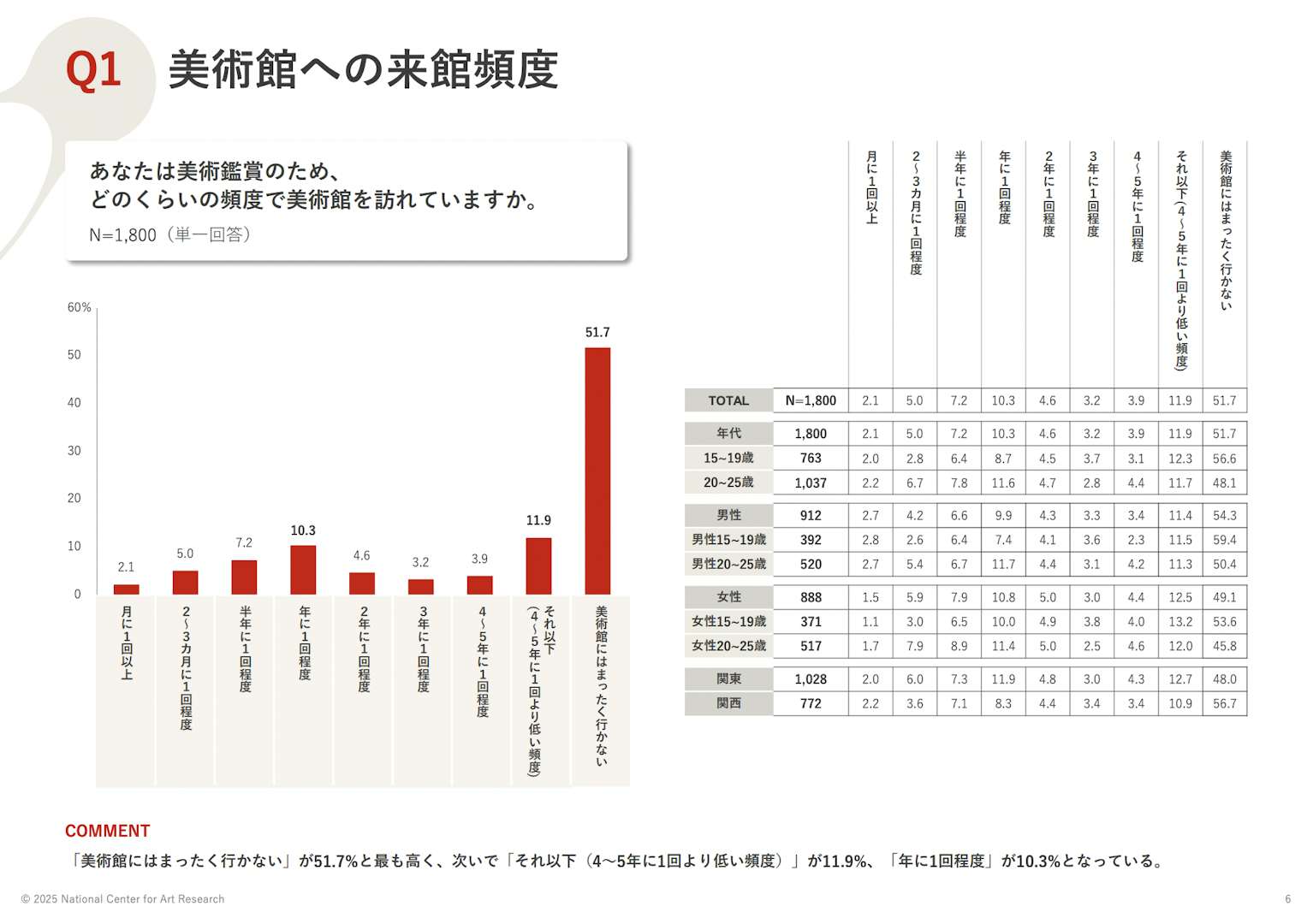 調査では美術館の来館頻度について、「美術館にはまったく行かない」が51.7%ともっとも高く突出。次いで「それ以下(4~5年に1回より低い頻度)」が11.9%、「年に1回程度」が10.3%。若年層の美術館に対する興味関心の薄さが浮き彫りとなったかたちだ。