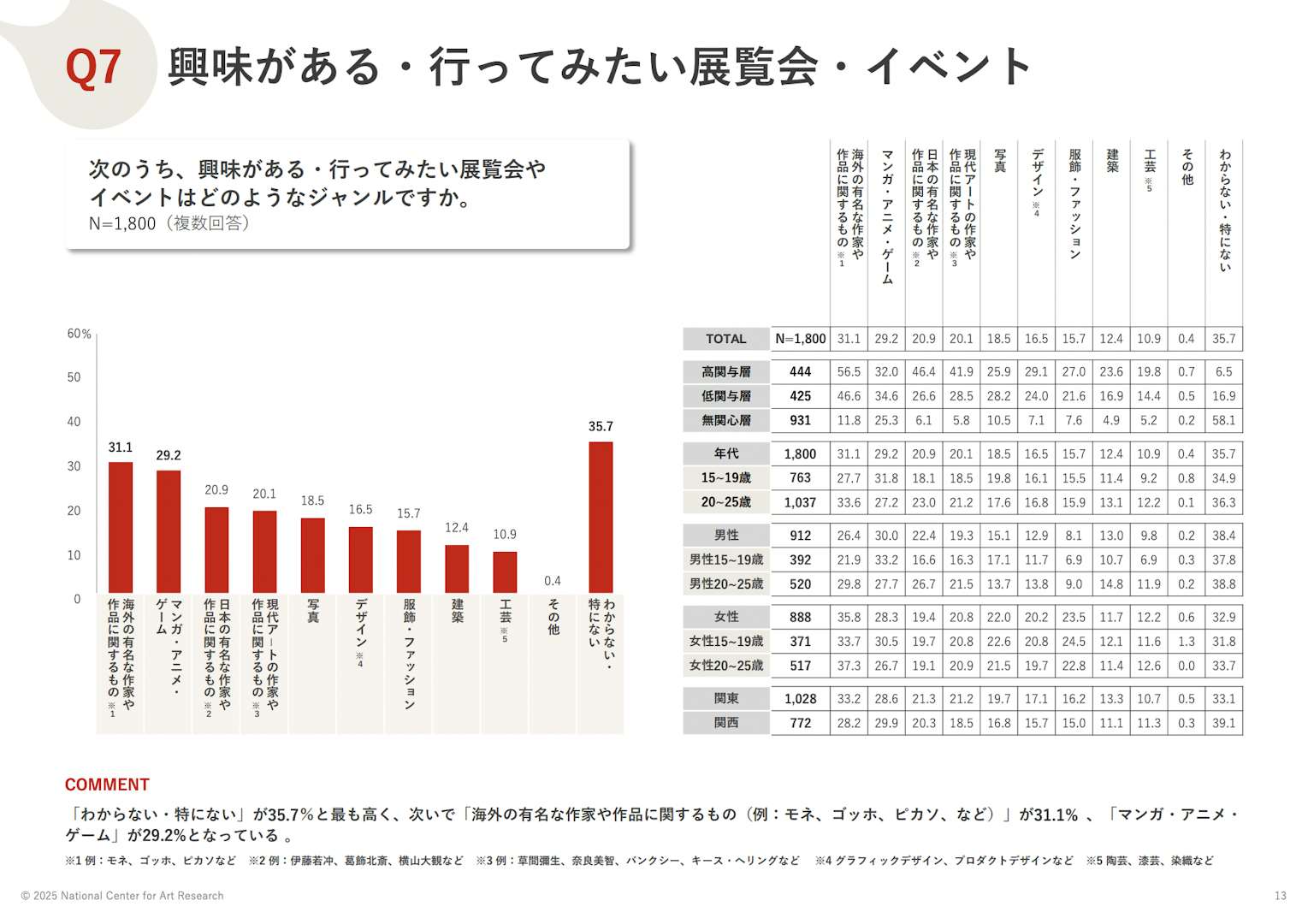 「興味がある・行ってみたい展覧会・イベント」では、「わからない・特にない」が35.7%ともっとも高い数字。次いで「海外の有名な作家や作品に関するもの(例:モネ、ゴッホ、ピカソ、など)」が31.1% 、「マンガ・アニメ・ ゲーム」が29.2%となっている。前者はいわゆる「ブロックバスター」として多くの入場者数を記録することが多く、一般的な興味関心とも一致する。また「マンガ・アニメ・ ゲーム」の比率の高さ、コンテンツビジネスの強さを物語る数字と言えるだろう。