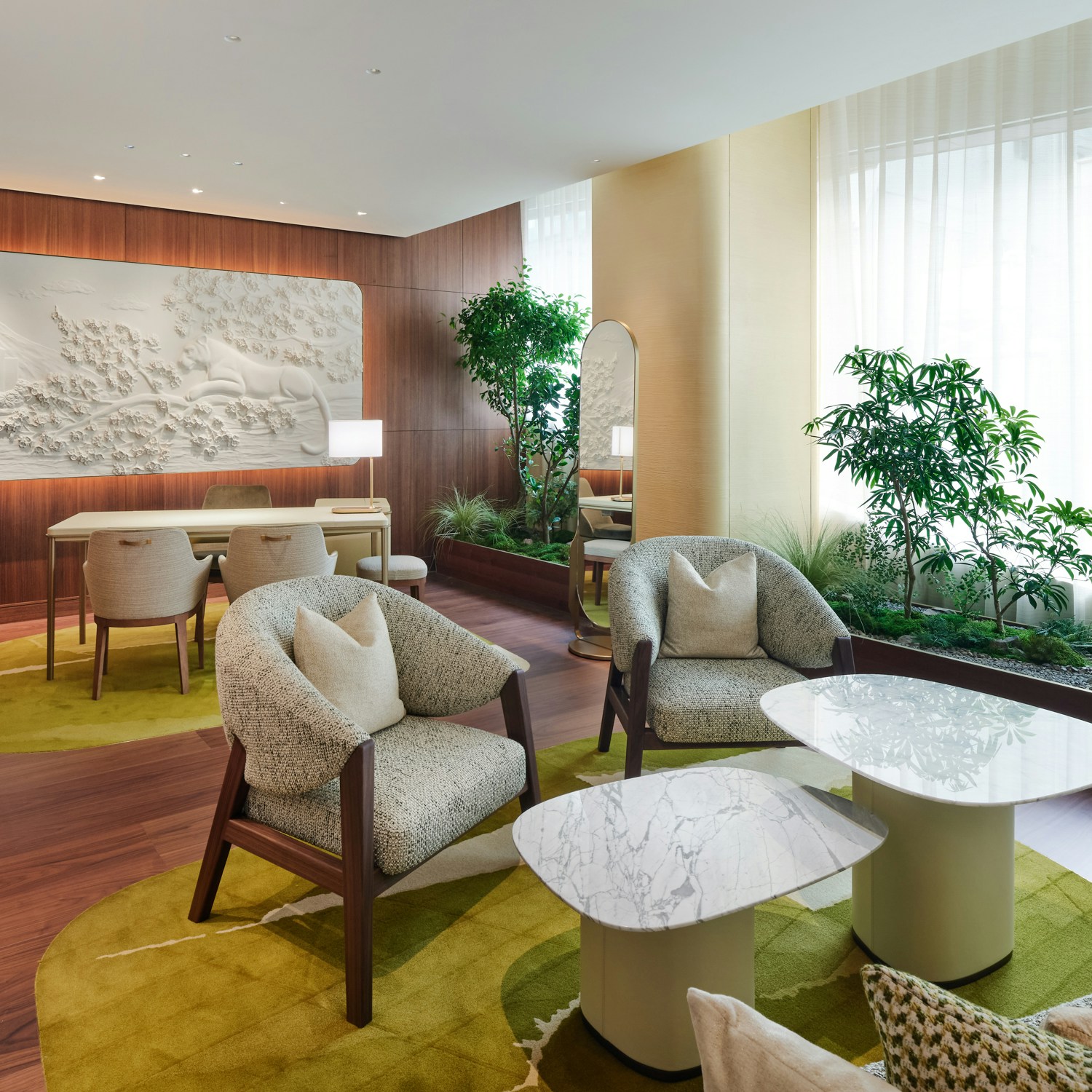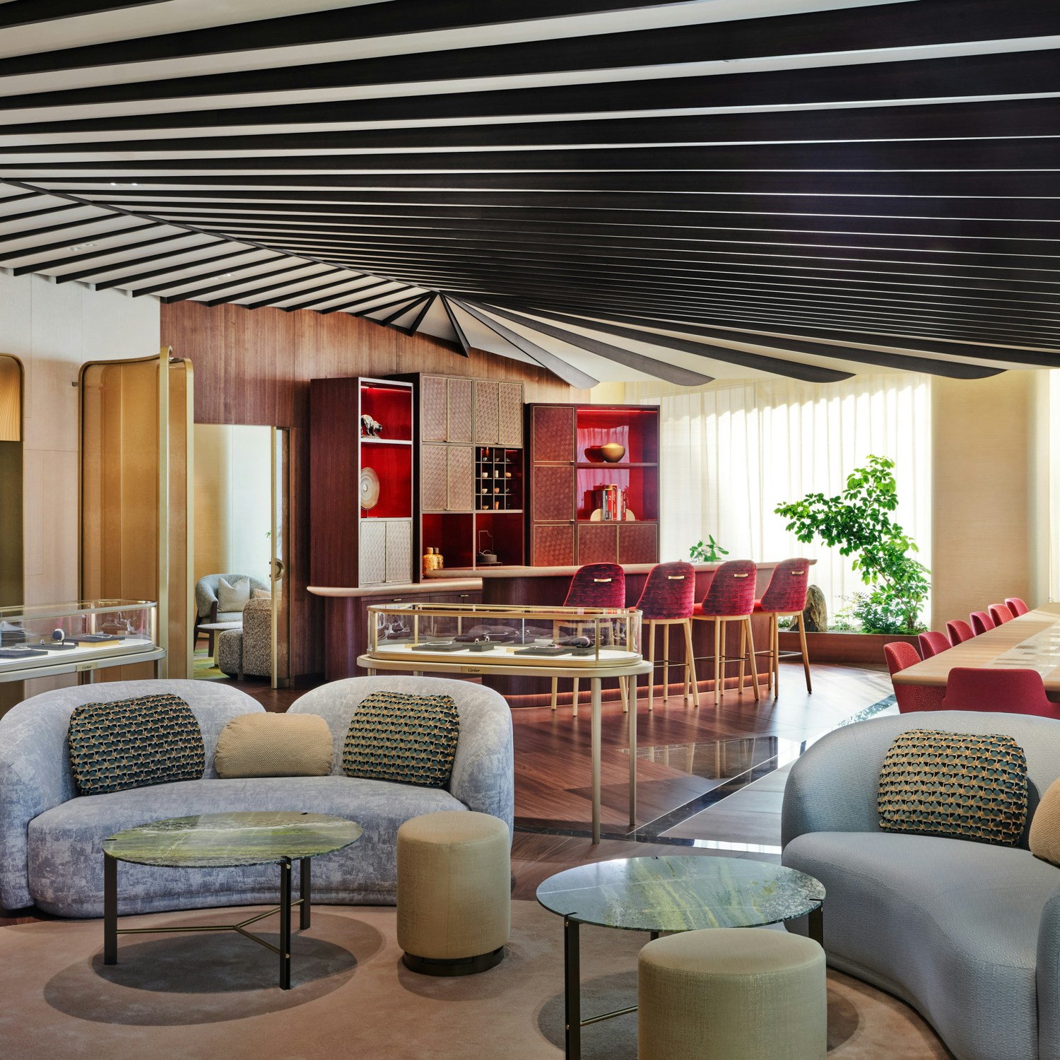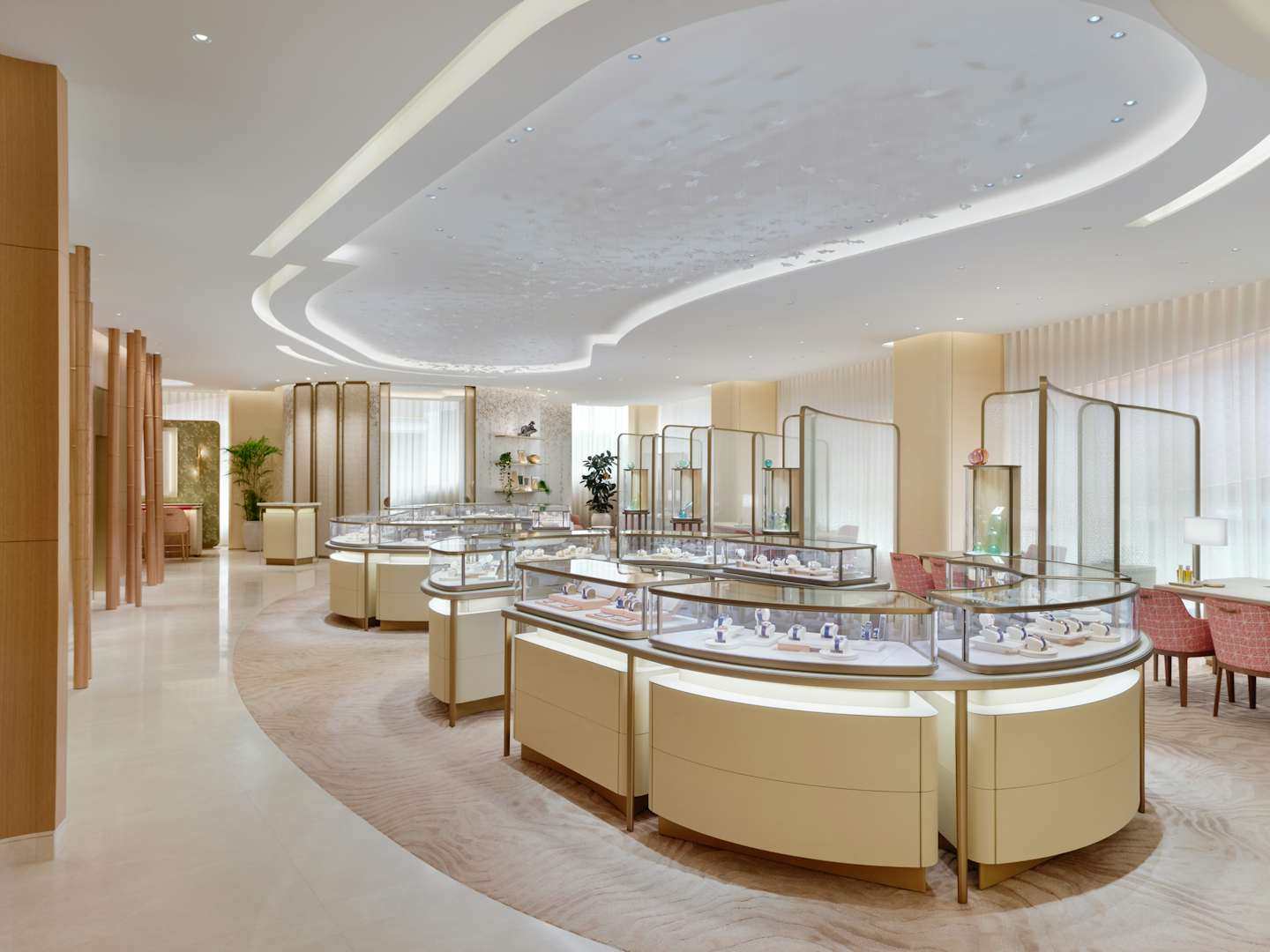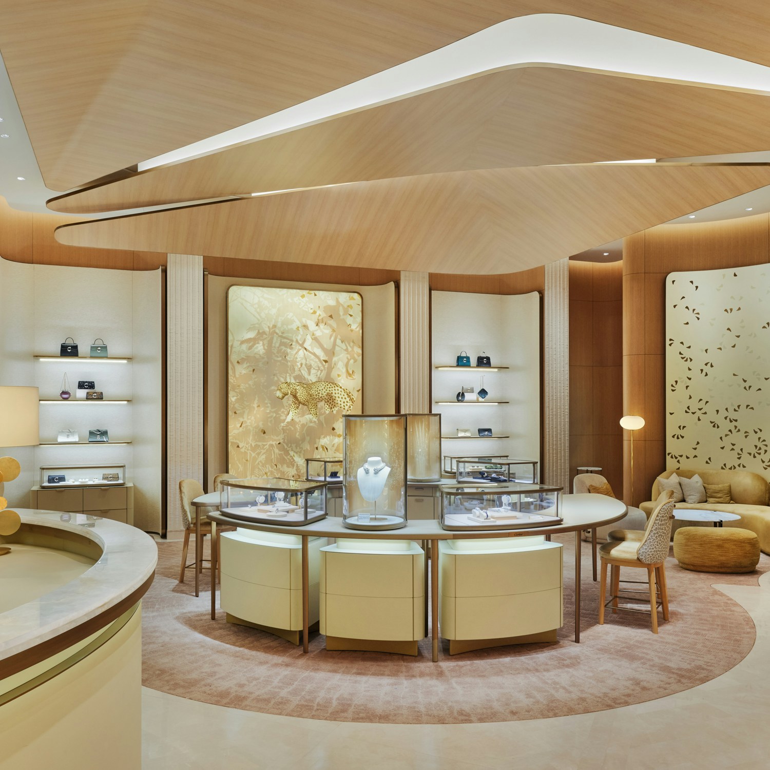 内装は、カルティエのブティック内装を2002年から手がけてきた、建築家のブルーノ・モワナー率いるモワナー ベタイユ。ファサードを抜けると、メゾンの象徴である「パンテール」の精神が息づく優雅な空間へと足を踏み入れることとなる。日本の伝統家屋を思わせる天然木が空間全体に温もりと安らぎをもたらすこのフロア。天井は折り紙から着想を得ており、石の床には、ヴェルサイユ宮殿に由来するパーケット模様が施された。日本とフランス、両国の要素を巧みに取り入れた構造だ。