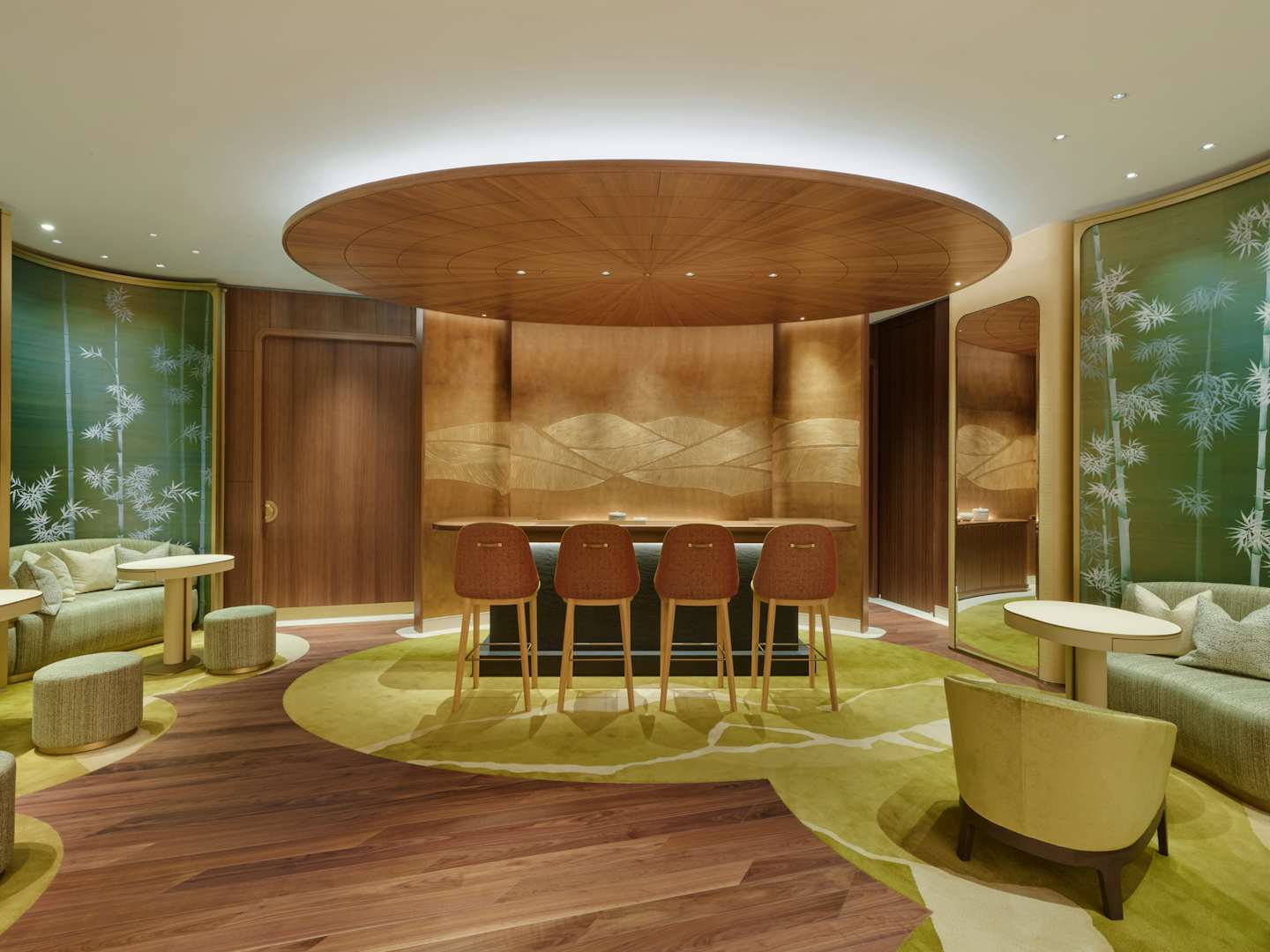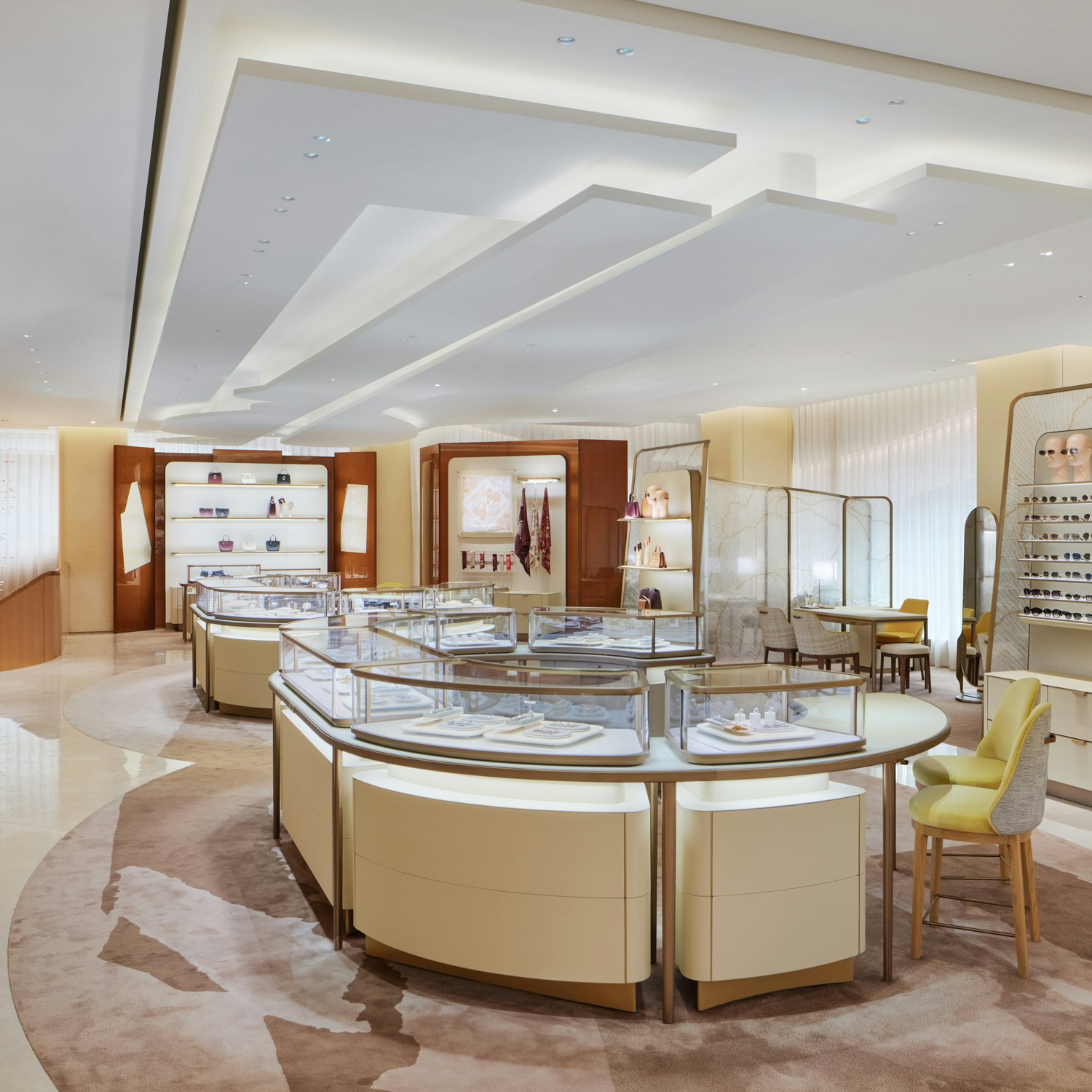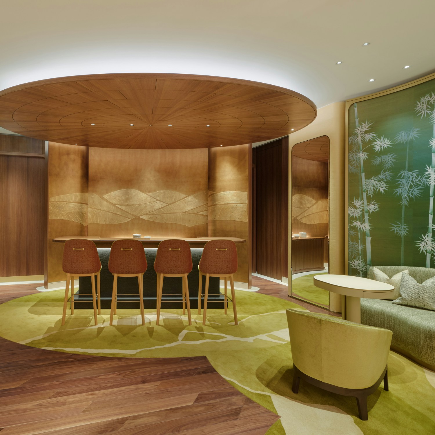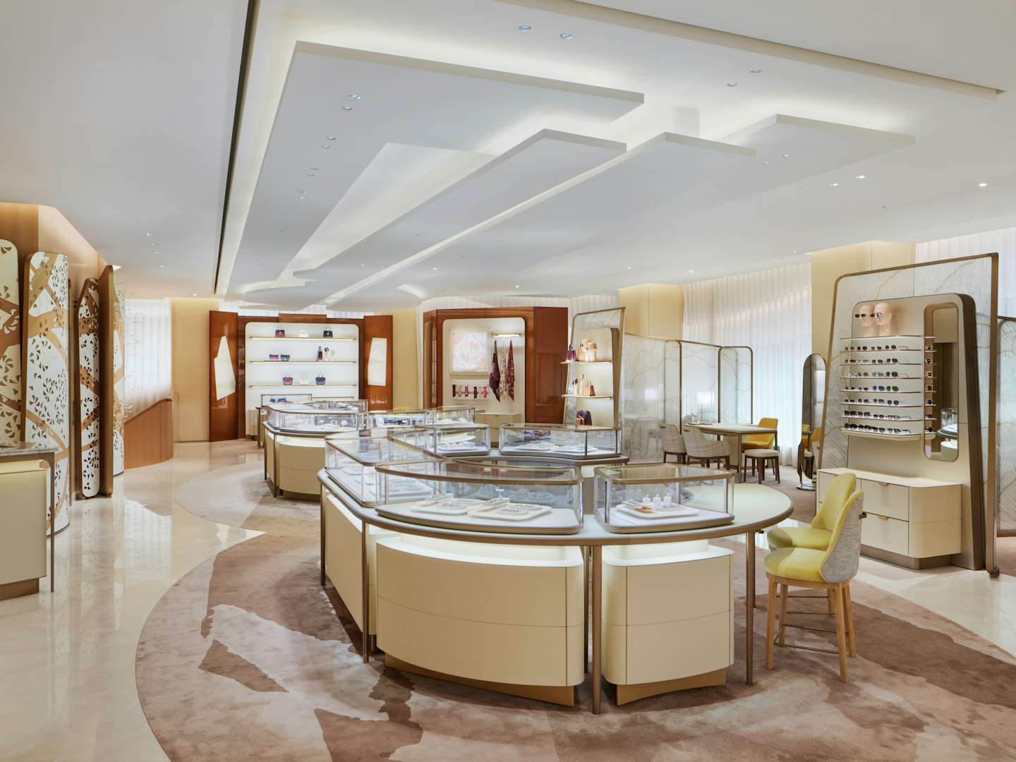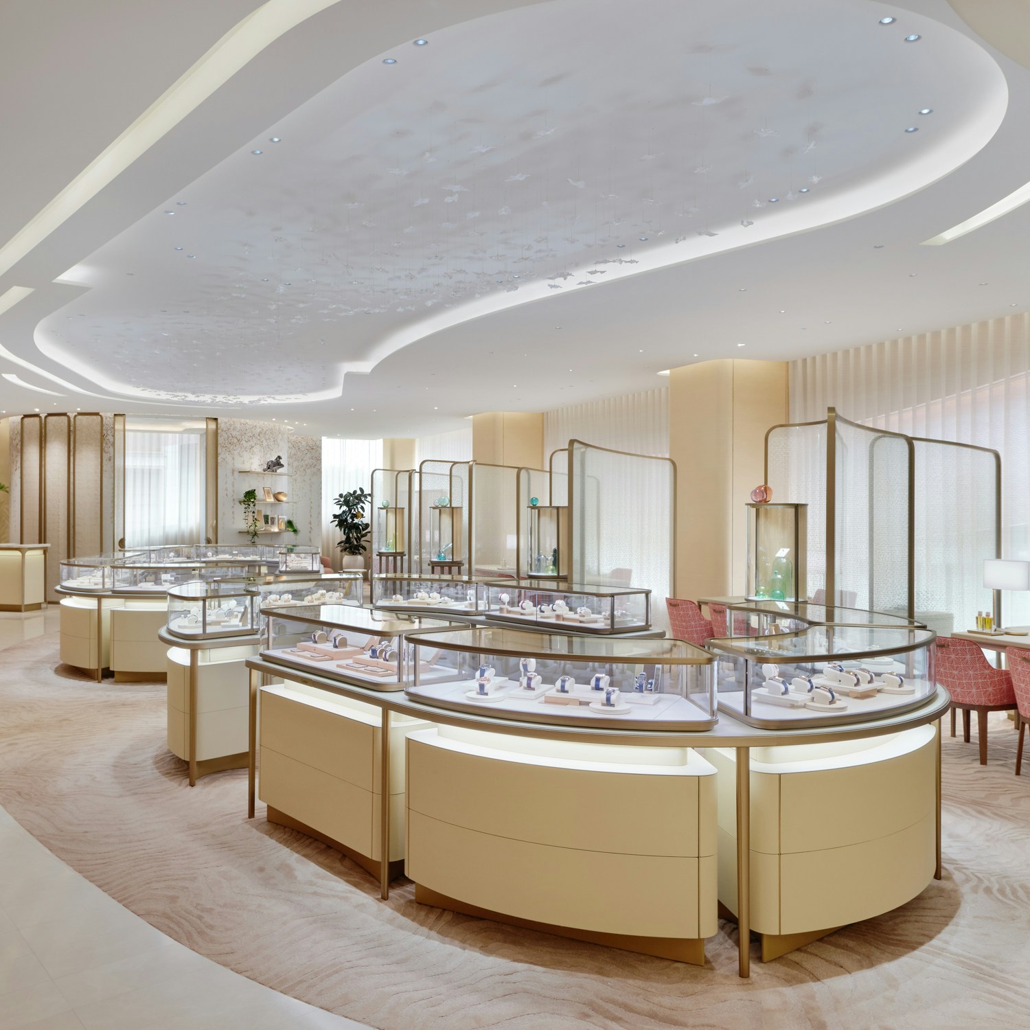 内装は、カルティエのブティック内装を2002年から手がけてきた、建築家のブルーノ・モワナー率いるモワナー ベタイユ。ファサードを抜けると、メゾンの象徴である「パンテール」の精神が息づく優雅な空間へと足を踏み入れることとなる。日本の伝統家屋を思わせる天然木が空間全体に温もりと安らぎをもたらすこのフロア。天井は折り紙から着想を得ており、石の床には、ヴェルサイユ宮殿に由来するパーケット模様が施された。日本とフランス、両国の要素を巧みに取り入れた構造だ。