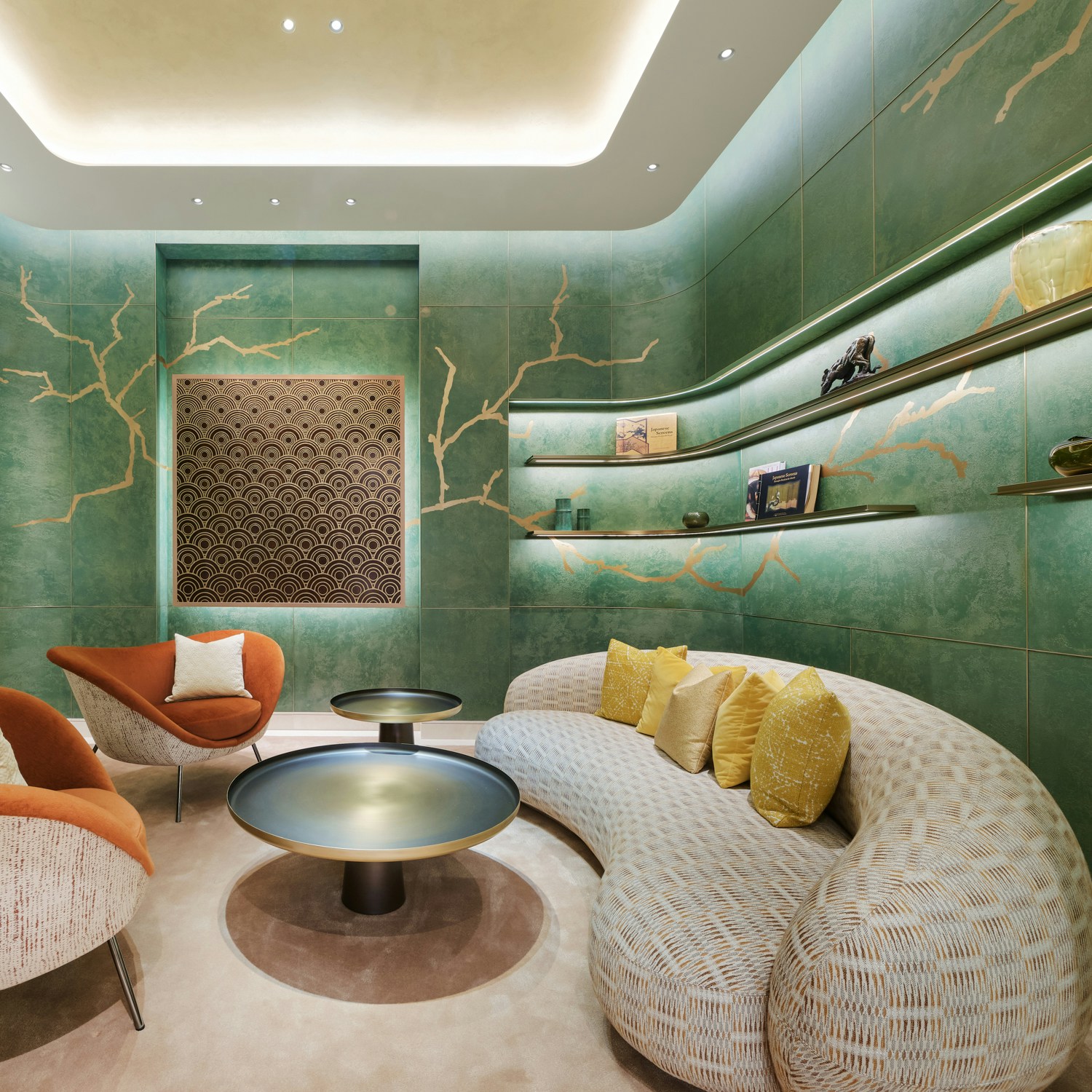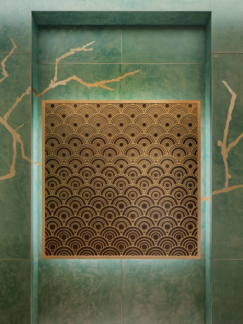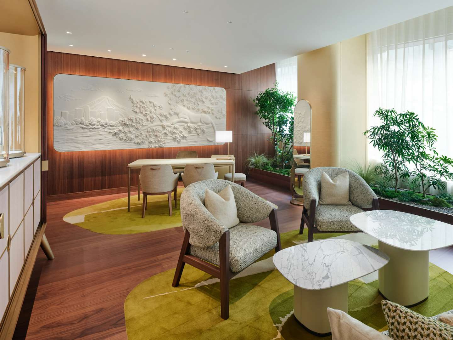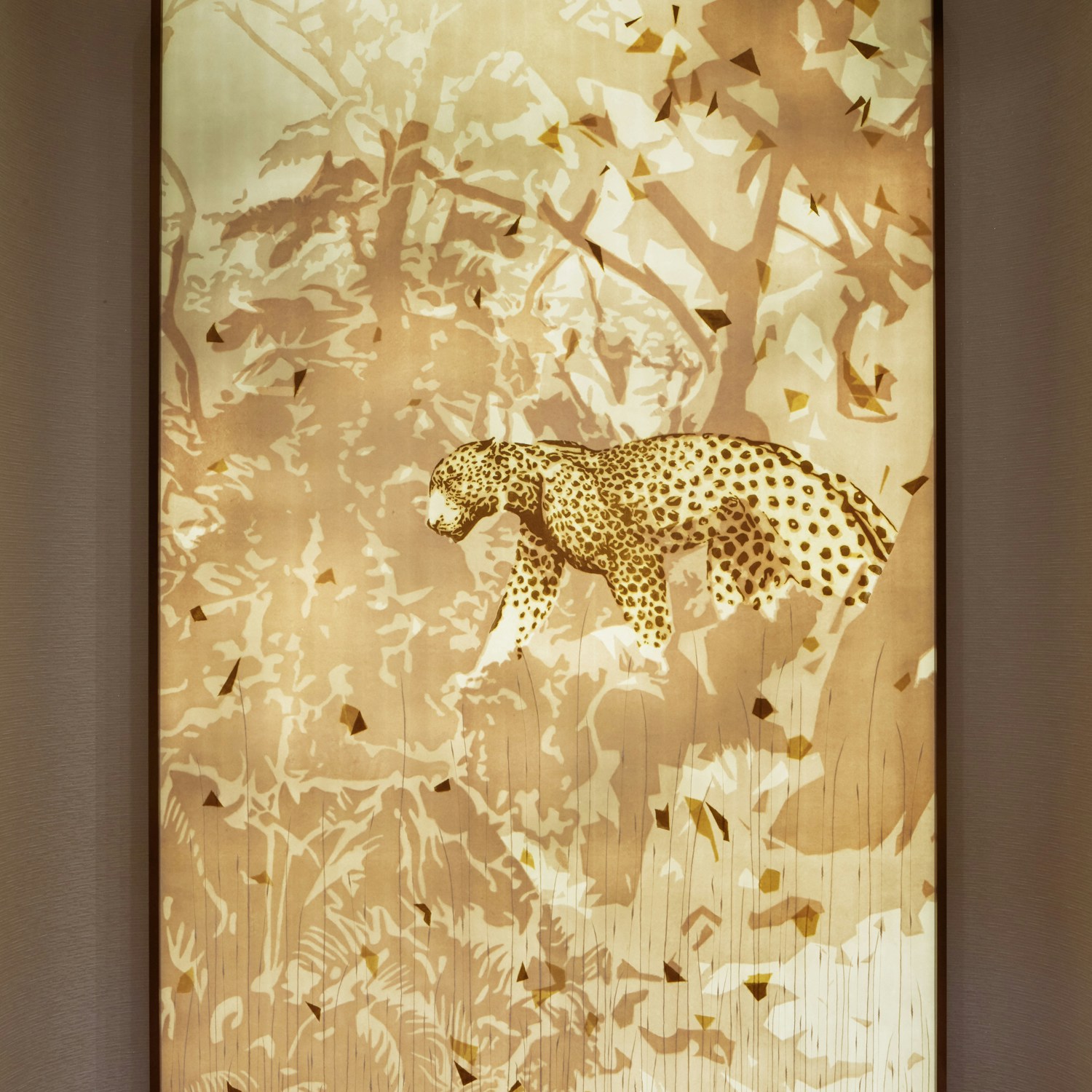 このフロアを彩るアートウォールに描かれているのは、森の中を歩く「パンテール」。和紙作家・堀木エリ子による同作、4層漉きの和紙で仕上げられ、繊細な和紙の質感と揺らめく光が、この空間が特別なものであることを伝えるる。