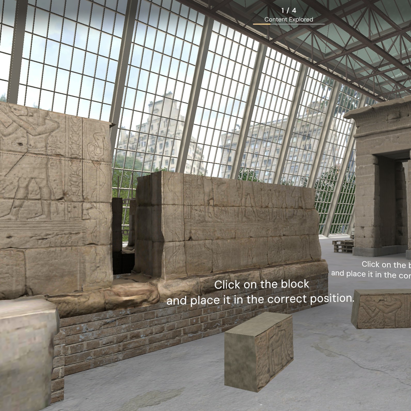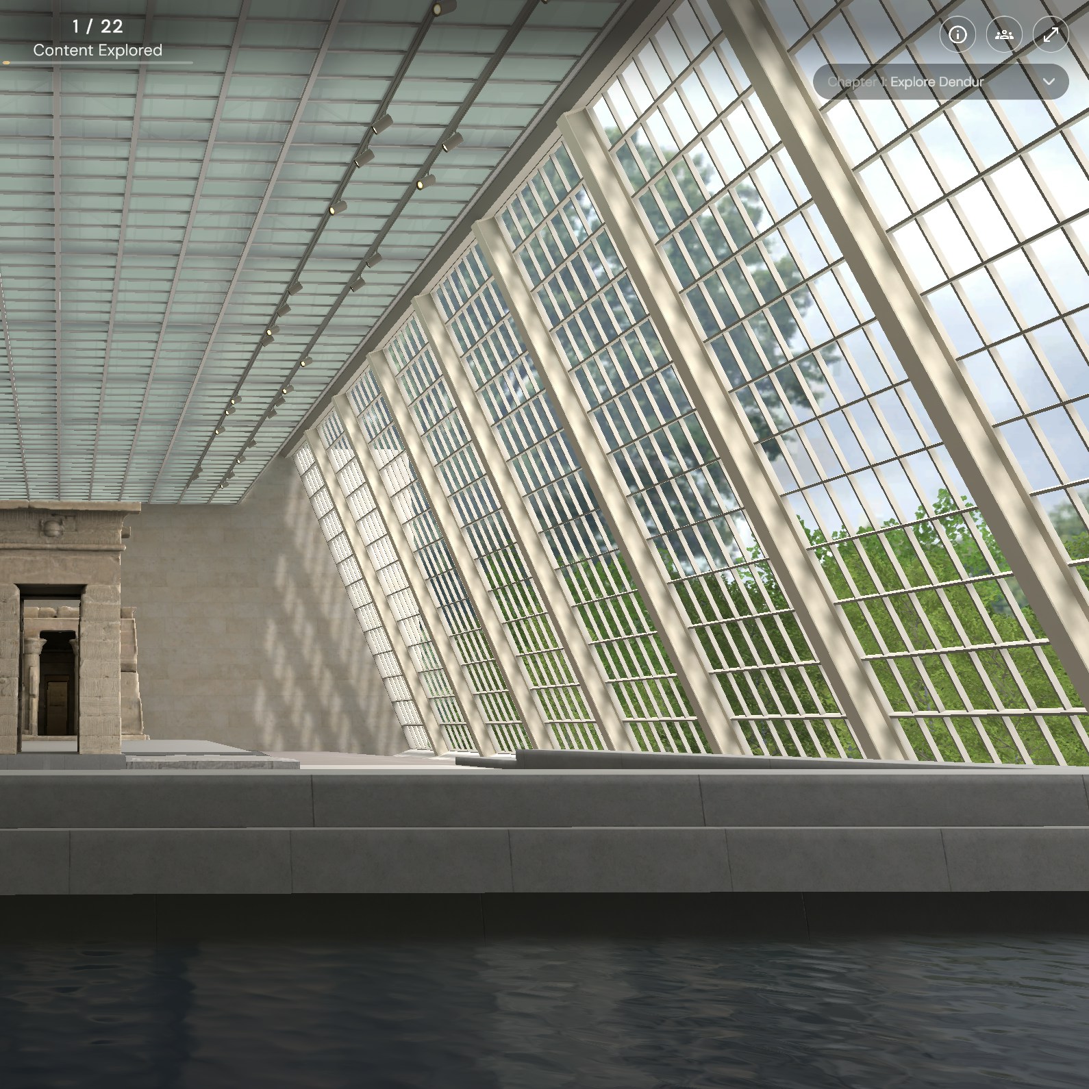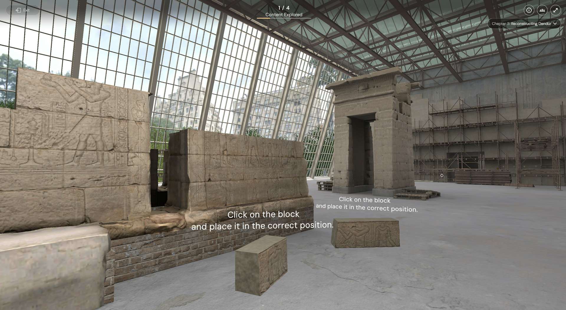 「Dendur Decoded」は4幕構成。「第1幕:デンドゥールを探索」から始まり、「第2幕:ヌビアのデンドゥール」ではデンドゥール神殿のもとの場所であるナイル川西岸と、それがどのように解体されたかについてを学ぶことができる。また「第3幕:デンドゥールの再建」では、ユーザーが神殿の一部を仮想的に再構築し、メトロポリタン美術館が1978年9月27日に一般公開した展示室でどのように遺跡を組み立て直したかを追体験できる。「第4幕:省察」では、過去のメットライブアーツ公演と、現代アーティストたちがこの神殿から受けたインスピレーションを紹介。音声メモを通じて個人的な考察や所感を残すオプションも用意されている。