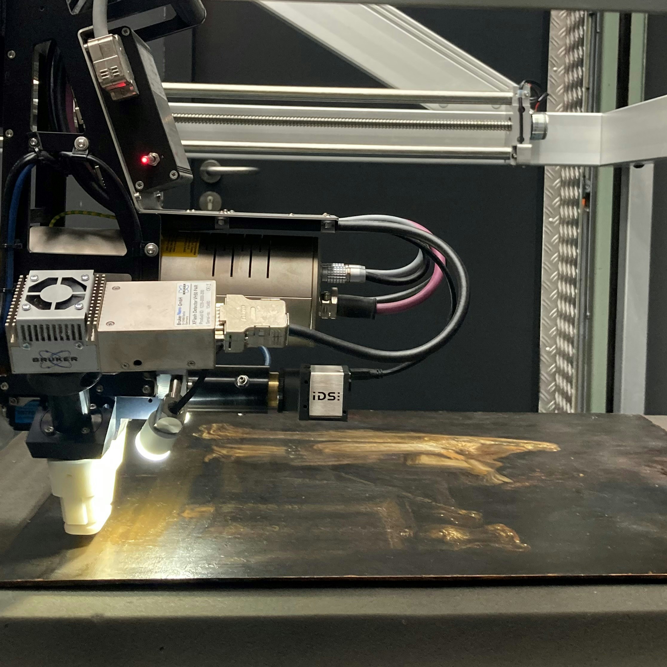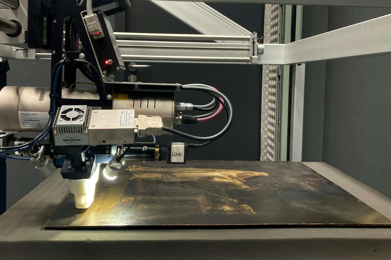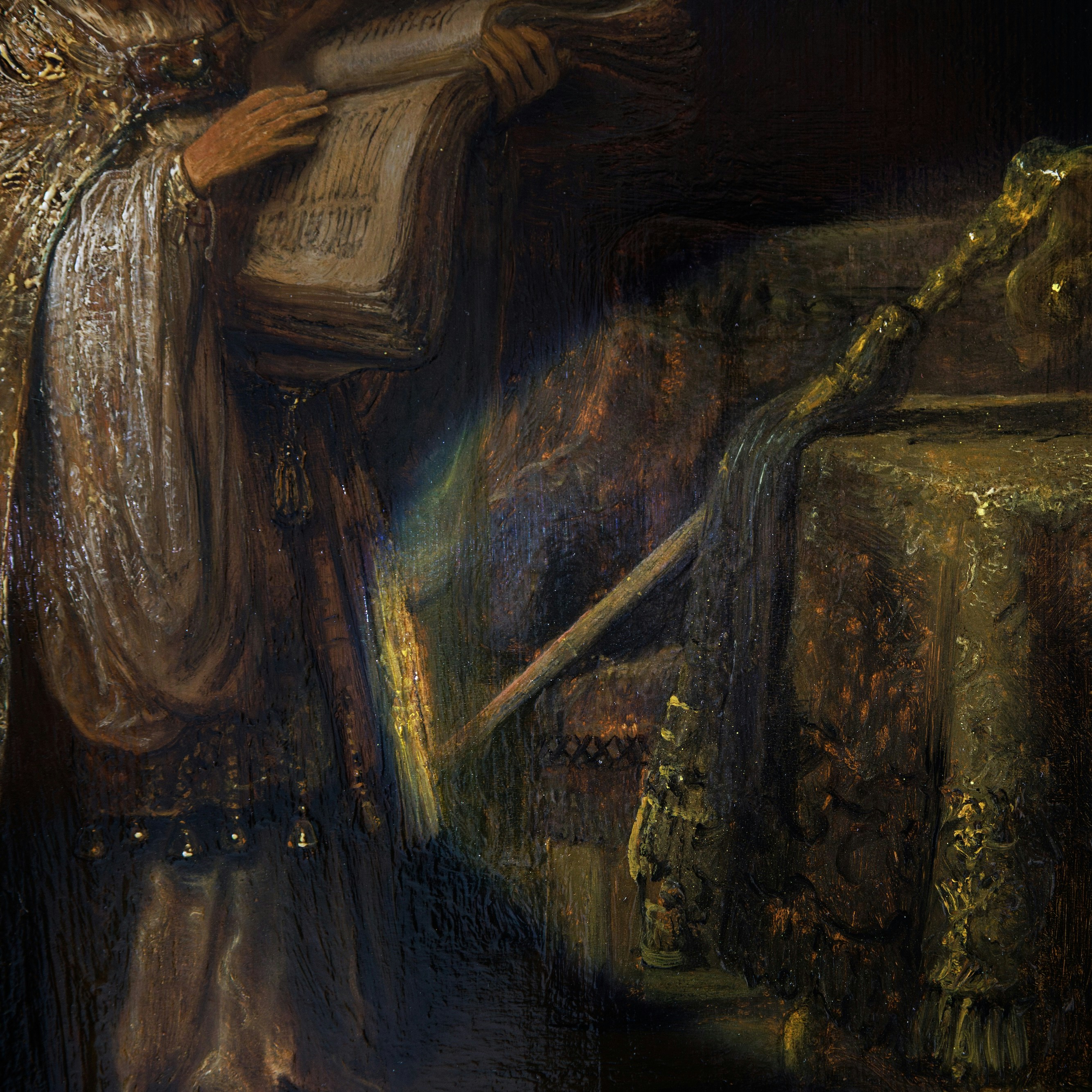 顔料の分析では、本作に用いられている絵具が同時期のレンブラント作品と一致しており、また、絵具層の重ね方や筆致の特徴も初期作品と共通していることが確認された。さらにマクロXRFスキャンによって構図変更の痕跡が発見され、制作過程における試行錯誤が明らかになった。署名の調査では、画面に記された署名が後世の加筆ではなく制作当時のものと認定され、木製パネルの年輪年代学(デンドロクロノロジー)分析により、作品に記された1633年という制作年も妥当であることが裏付けられた。
