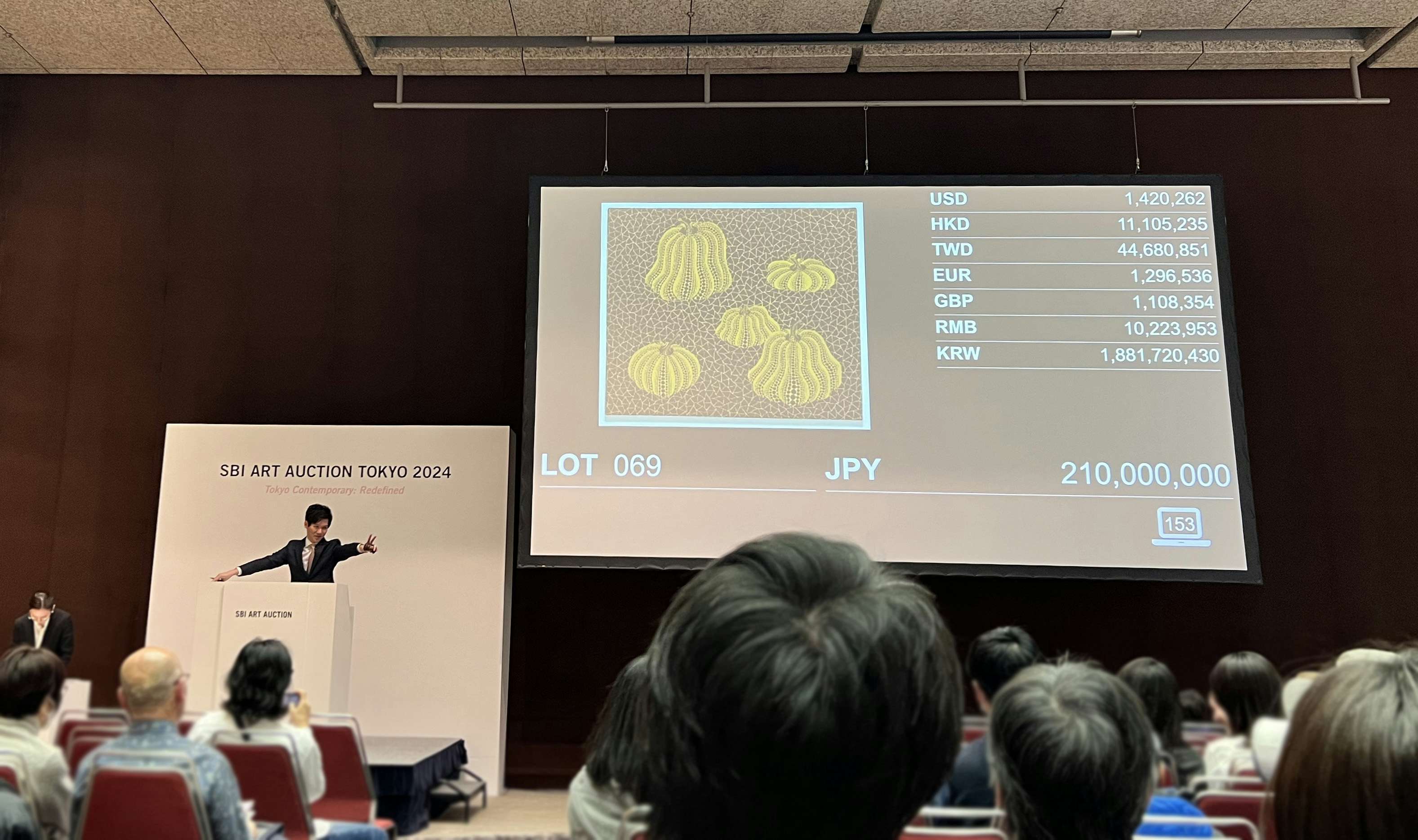 オークション会場より、草間彌生《Pumpkins》(2006)落札の様子