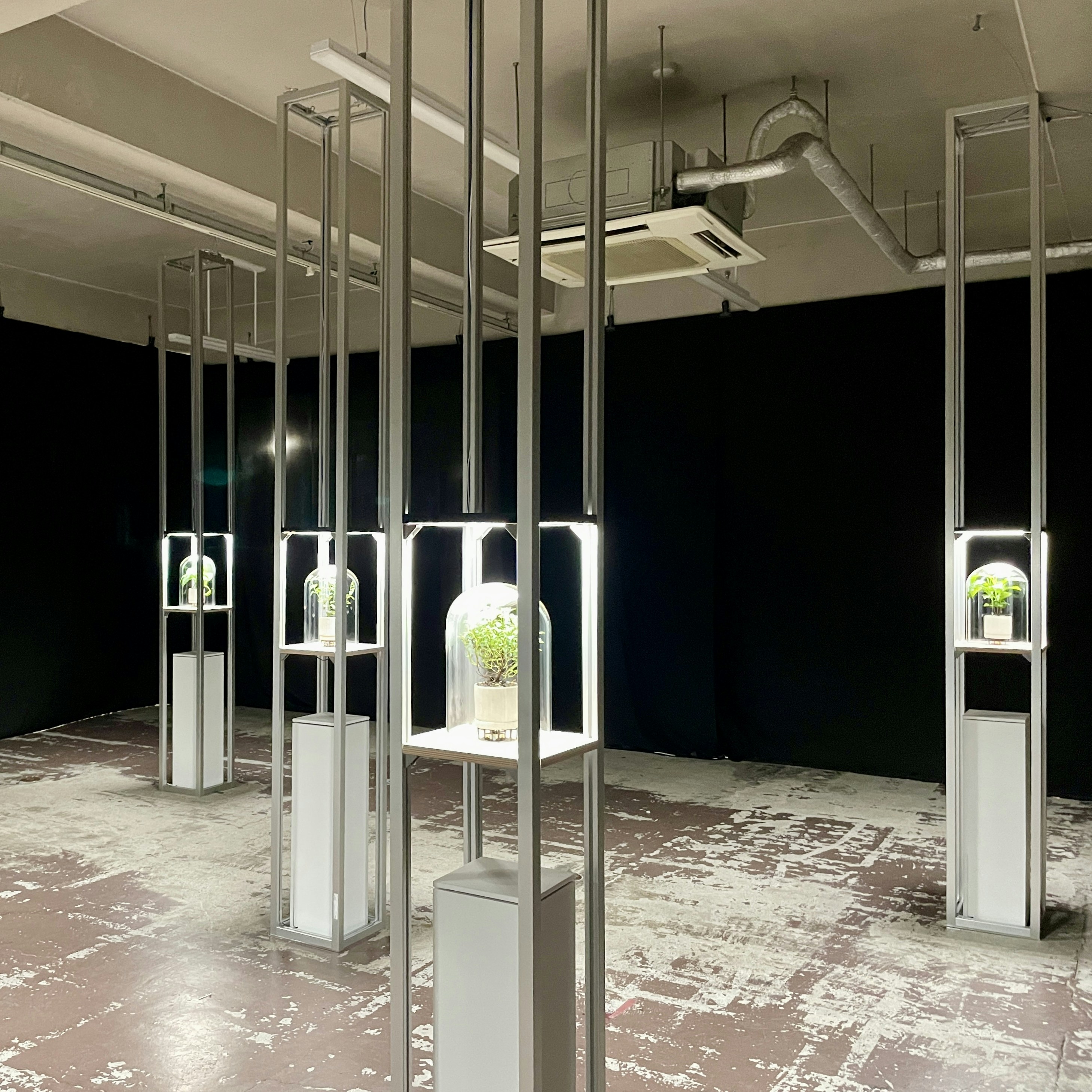 1階のスペースでは、西山美なコ(Yoshimi Arts)が1997年に西宮市大谷記念美術館の個展で発表したステージのようなインスタレーション作品《♡あこがれのシンデレラステージ♡》(1996)を再現。2階で展示されている森公一+真下武久(サードギャラリーAya)のインスタレーション《呼吸する庭》(2024)も印象的だった。ガラスの容器のなかに置かれた植物が光合成によって二酸化炭素を吸収し、容器内の二酸化炭素濃度の変化によって音が奏でられる。また、鑑賞者が作品の前に座ると、その呼吸のリズムに合わせて作品全体が明滅し、植物と人がコミュニケーションしているようなものだ。