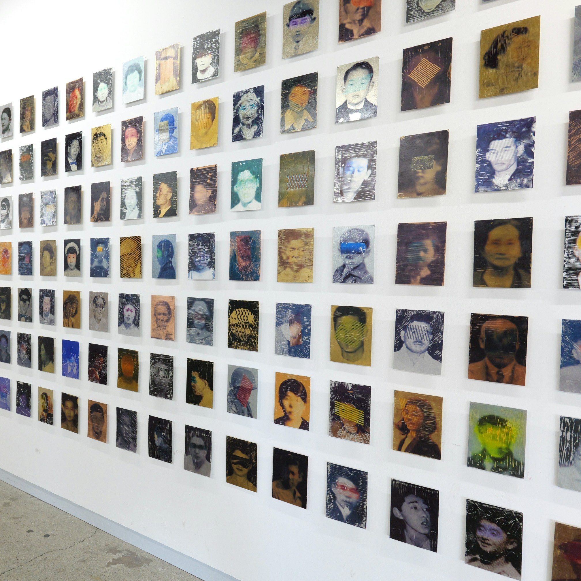 東京・馬喰町のKOKI ARTSは、中村亮一の作品を出展。活動拠点としていたドイツ・ベルリンで受けた偏見から、移民と社会の隔たりについて考えてきたアーティストだ。約10年にわたりつくり続けている作品《a study of identity》(2015-25)は、第二次世界大戦中の日系アメリカ人のポートレートを金属板に転写し並べた作品。壁面から浮いているかのように展示される人々の顔は、移民の置かれる不安定な状態が表現されている。