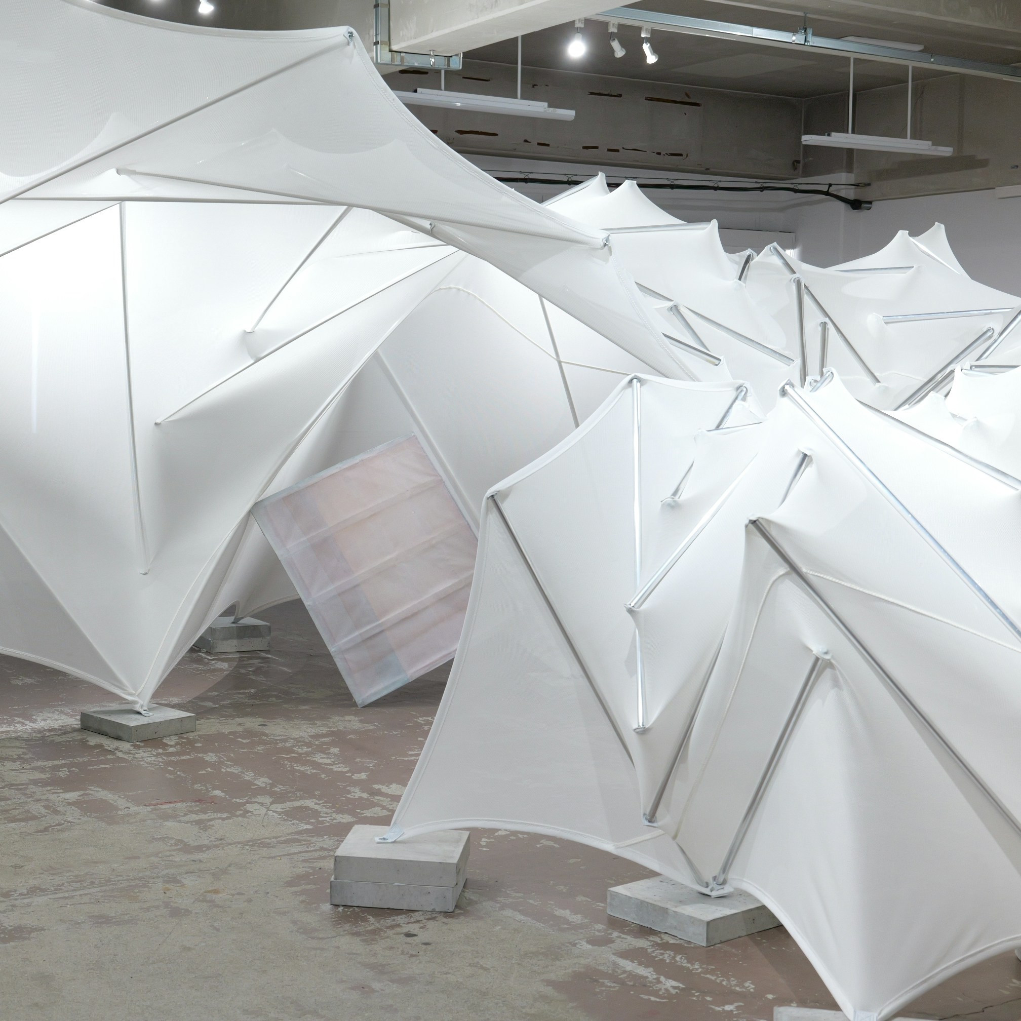 大阪のTEZUKAYAMA GALLERYは、日本と韓国を拠点にするユ・ソラの大規模なインスタレーション《当たり前なのは、》(2020-25)を会場で展開。ソラは白い布と黒い糸によって日常の様々な風景を立体化することで知られている。会場ではソファやベッド、リビングの机などを展開。さながらモデルルームのような印象を与えるこの空間では、日常の虚構性や脆弱性が滲み出している。