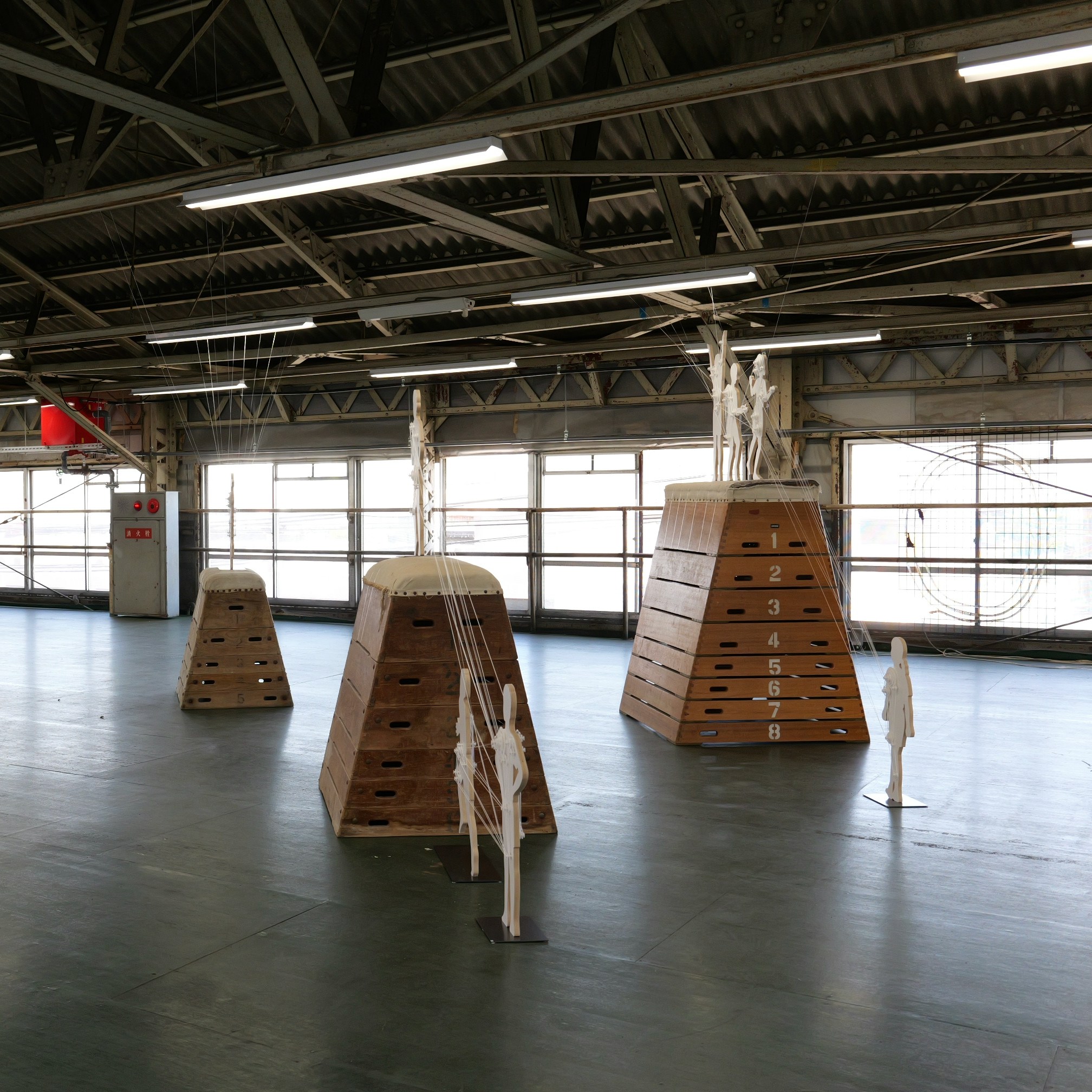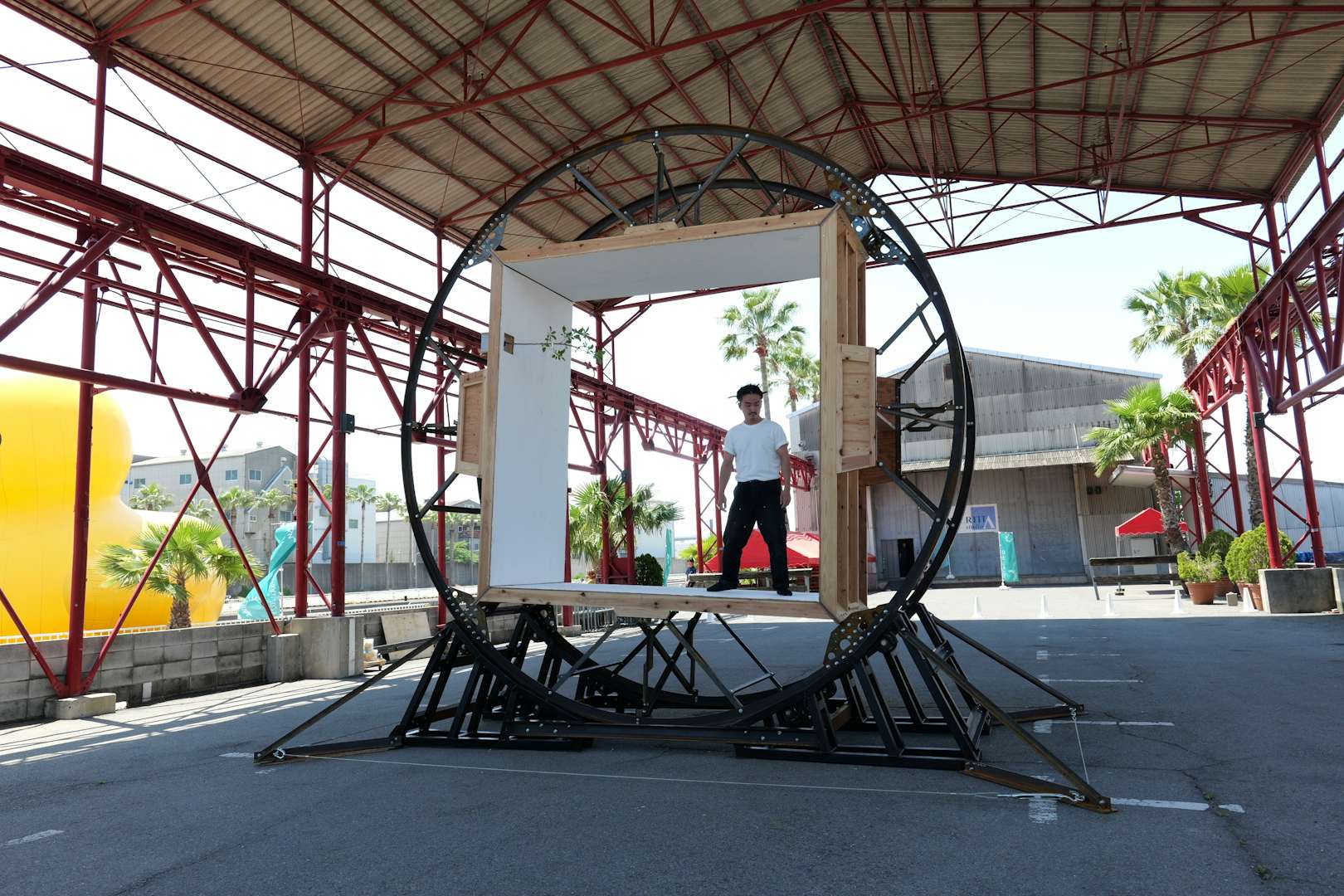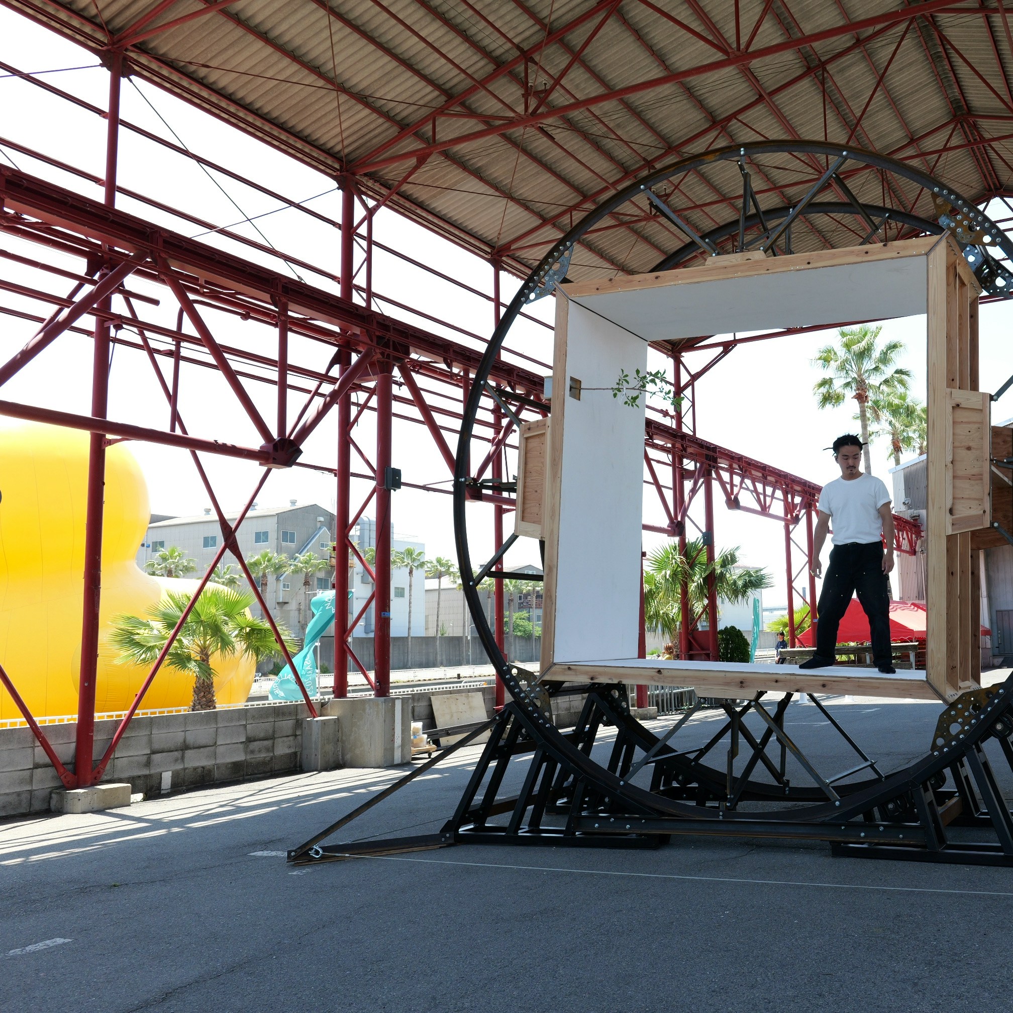 屋外でも展示は行われている。赤鉄骨と呼ばれるかつてのクレーンの跡では、大阪のMarco Galleryが髙橋穰による《装置 #1》を展示。物体と万有引力の関係に着目し、彫刻を通じてそこに介入する髙橋は、自身が自身が重力を感じながら運動をつくりだすことができる巨大な装置を会場につくり上げた。