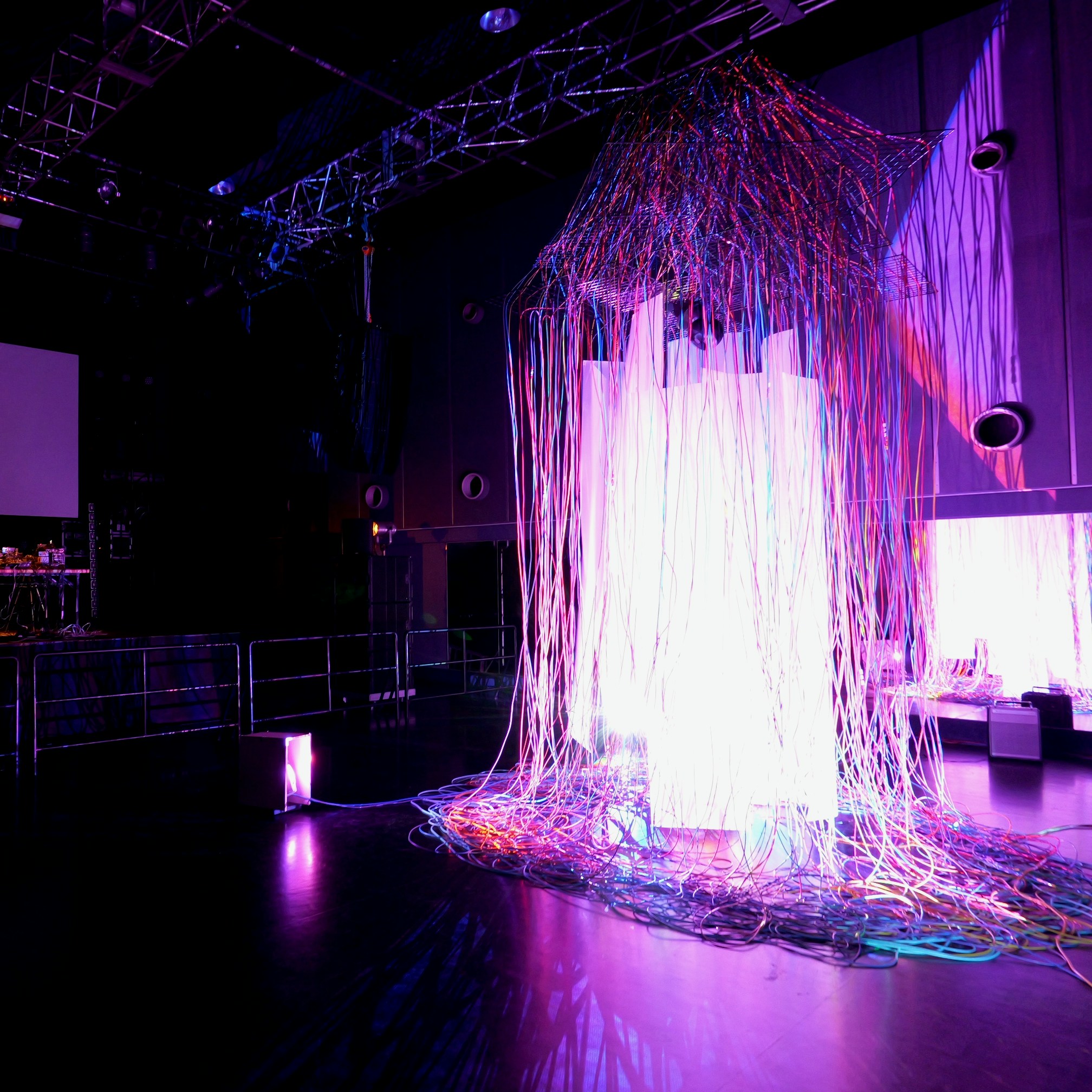 京都のMORI YU GALLERYは河合政之の《四元素+natura:date》(2025)を、「パルティッタ」の屋内で展開。コンピューター・グラフィックと見紛うような映像を、アナログ機材のみでつくり出した作品だ。リアルタイムで変化し続ける光と音の生命体のような躍動を感じたい。