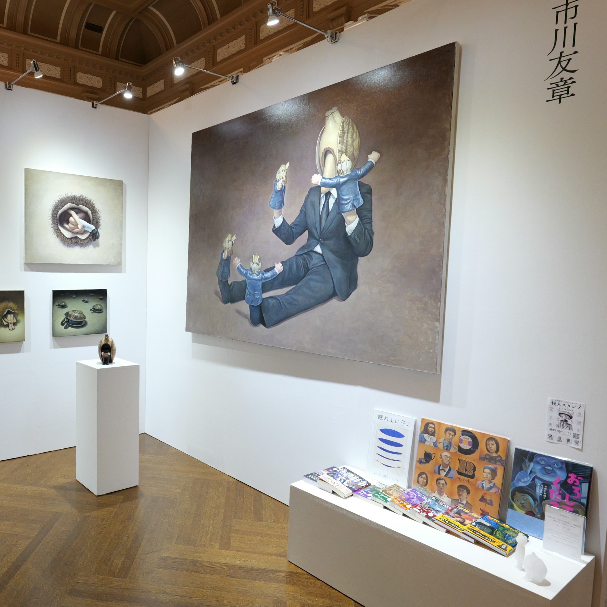 東京の√K Contemporaryは、体は人間、頭はモンスターという異様でどこか懐かしみのある「キャラクター」たちが日常を送る光景を描く市川友章をピックアップ。2011年の東日本大震災を目の当たりにし、自分が特撮映画の世界のなかに投げ出されたような感覚になったという市川。絵画に漂う現代社会への疑義はどこか石田徹也の作品を彷彿とさせるが、市川も石田と同じロスジェネ世代だという。ある世代が共有している社会への問いの表出として見てもおもしろい。