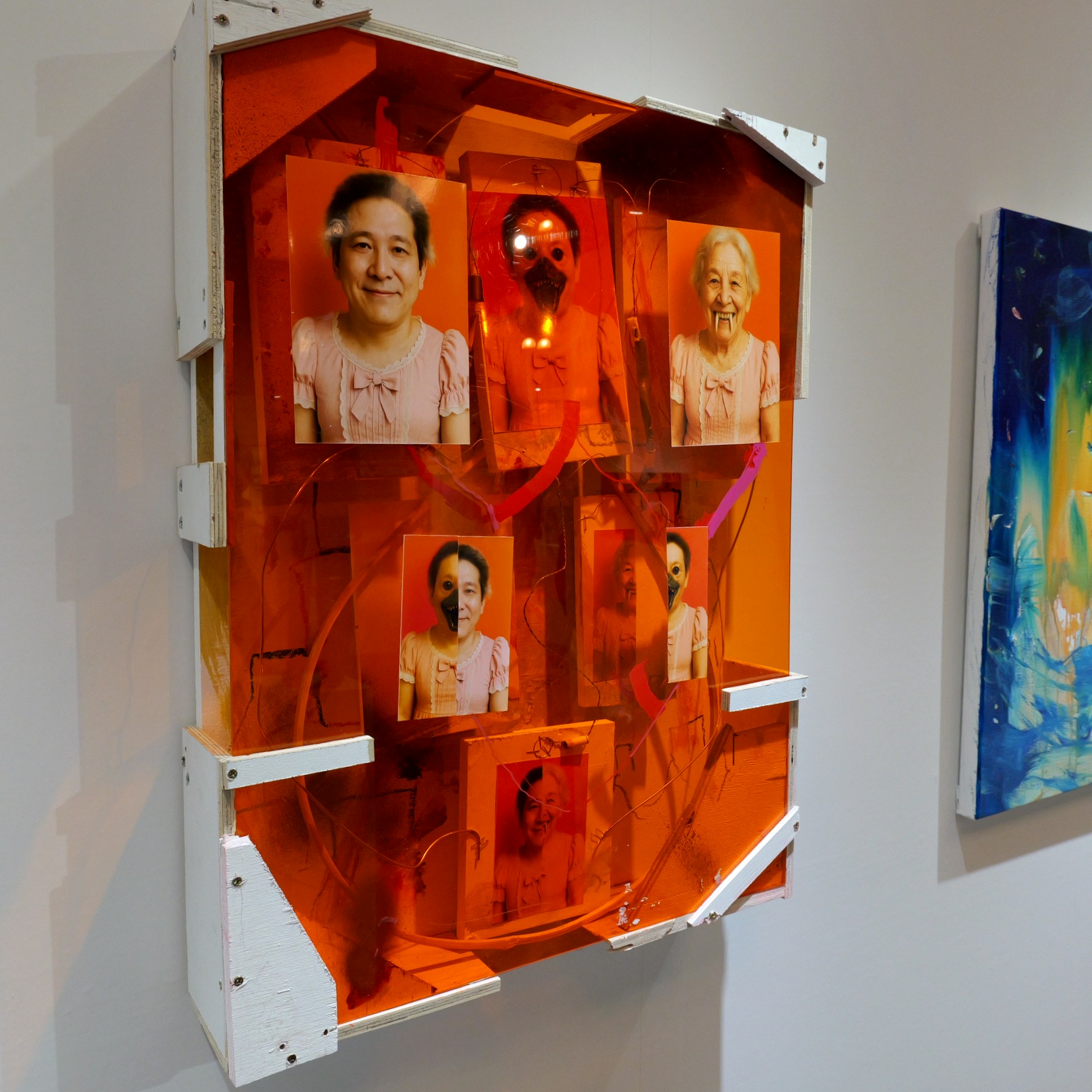 東京のEUKARYOTEが出展している磯村暖の新作にも注目したい。AI生成による写真と多層的な立体構成を用いて、アクリルボックスの中に「家系図」を描くという本作は、磯村が自身の未来像としてAI生成した3つの自己像が、3人の親として登場する。クィアとして自らの遺伝子に複雑な思いを抱いてきた磯村が、遺伝子や家族といった概念に挑戦した意欲作だ。