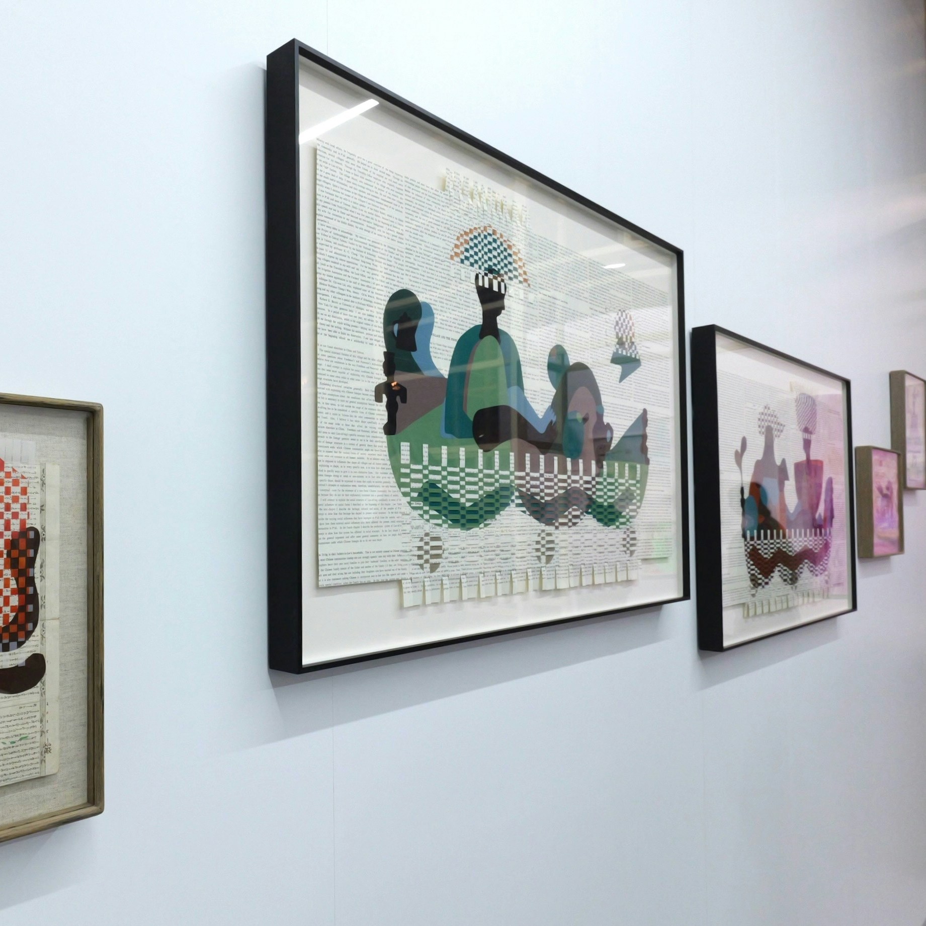 Takuro Someya Contemporary Art(東京)とTKG+(台北)のブースでは、大山エンリコイサムとジャム・ウー(吳耿禎)の作品が並ぶ。過去の人物イメージのうえに「クイックターン・ストラクチャー」を重ねることで身体や時間を浮き上がらせる大山の作品と、紙や布、刺繍を切り、縫い、織り込むことでその時間そのものを作品に体現するウーの作品が、空間を構成していた。
