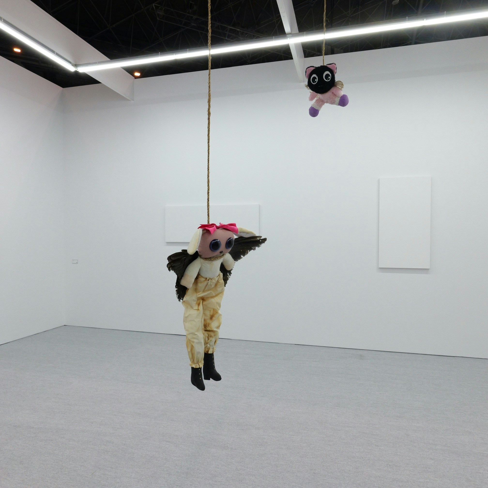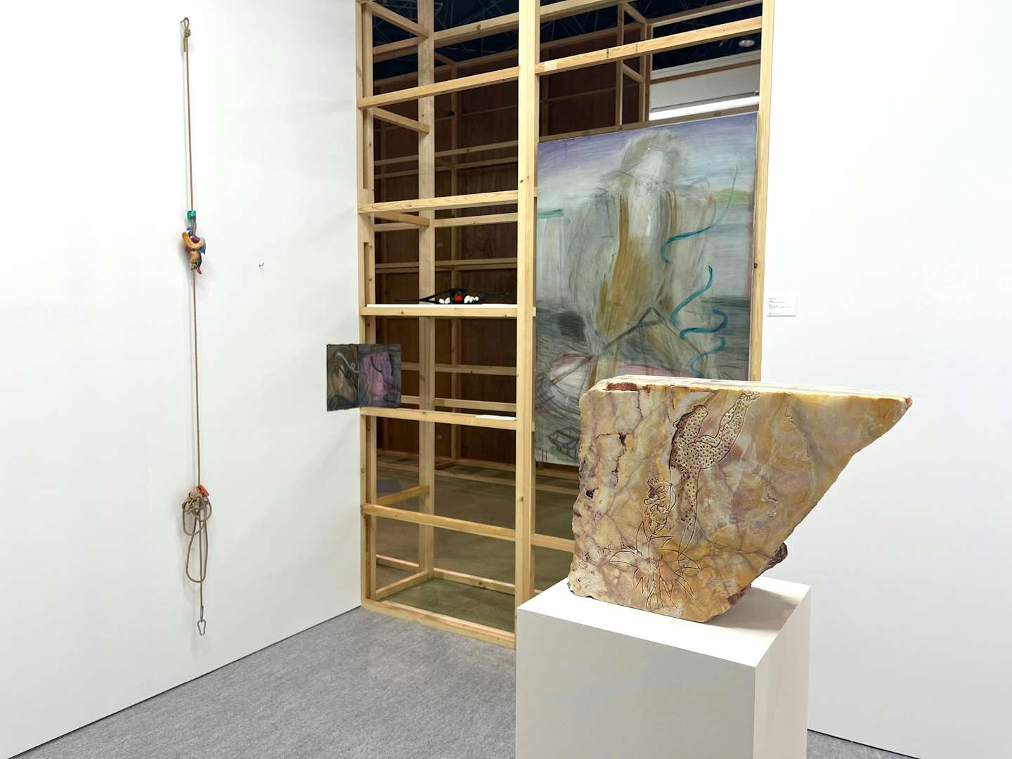TARO NASU(東京)はグラッドストーンギャラリー(ニューヨーク)と組んでブースを構築。展示空間の中央には、岡山芸術交流2023の廃プールに巨大なぬいぐるみを出現させたことで大きなインパクトを残した、グラッドストーンに所属するプレシャス・オコヨモンの小作がぶら下がる。壁面にはTARO NASUを代表する作家のひとり、ライアン・ガンダーによるキャンバス面が変動する平面作品が展示されている。