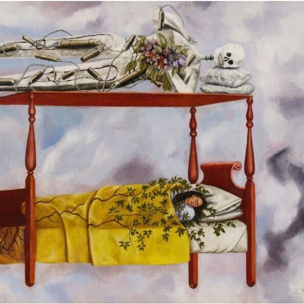 《El sueño(La cama)》は、カーロが激動の時期に制作した作品だ。1940年、元恋人レオン・トロツキーが暗殺され、その後ディエゴ・リベラとの離婚と再婚を経験した年でもある。作品には、精神的緊張、再生、そして自己の脆さと強さが複雑に交差する、カーロ芸術のなかでももっとも象徴的なモチーフが凝縮されている。