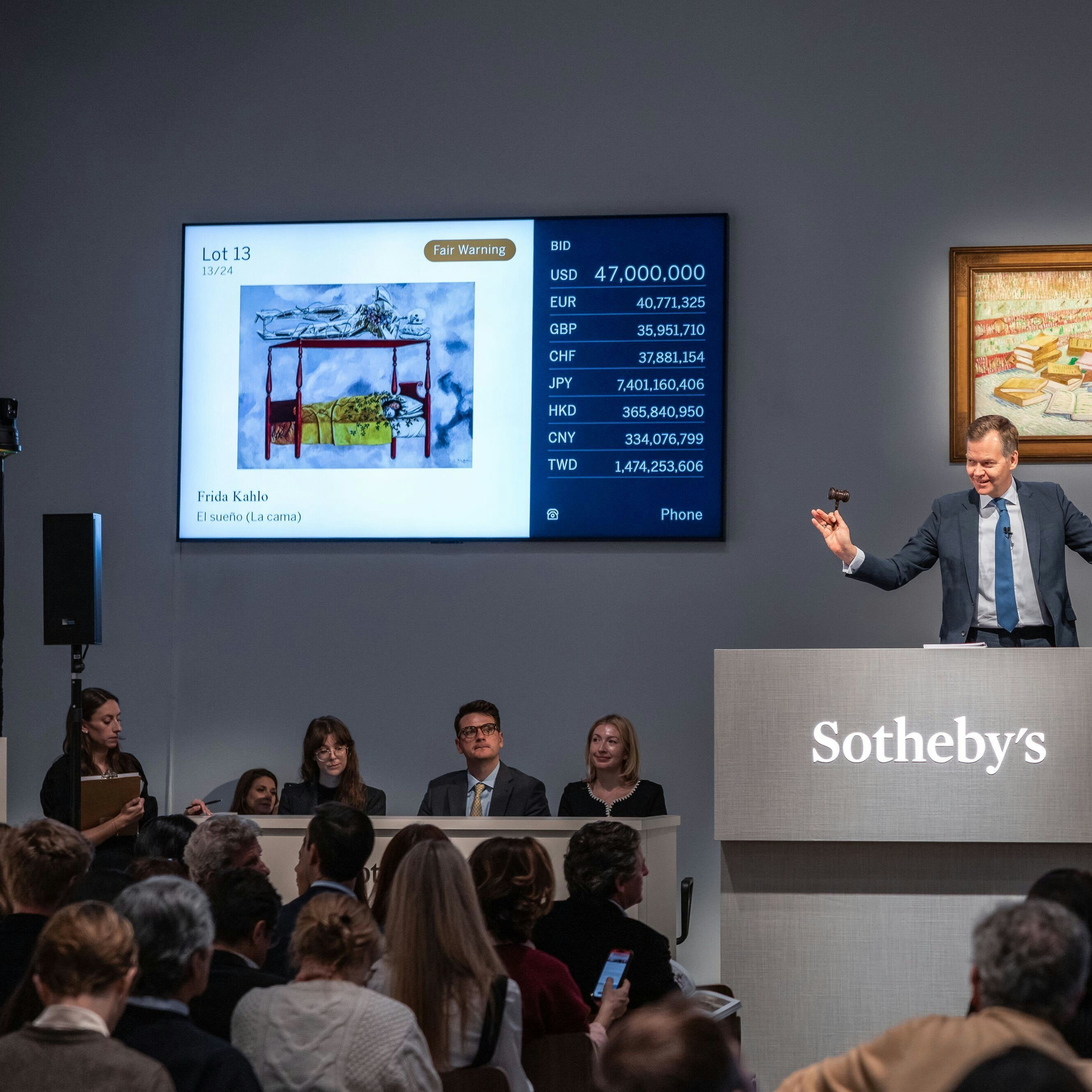 入札は約5分間にわたって2名の競合者が応酬。その末にサザビーズのラテンアメリカ美術部門責任者アンナ・ディ・スタシとの電話入札者が落札した。ディ・スタシは「1980年に5万1000ドルで落札されたこの作品が、45年後に5500万ドルを超えるとは誰も想像しなかったでしょう。この結果は、カーロの天才性、そして女性アーティストへの評価がどれほど進展したかを示すものです」とコメントしている。