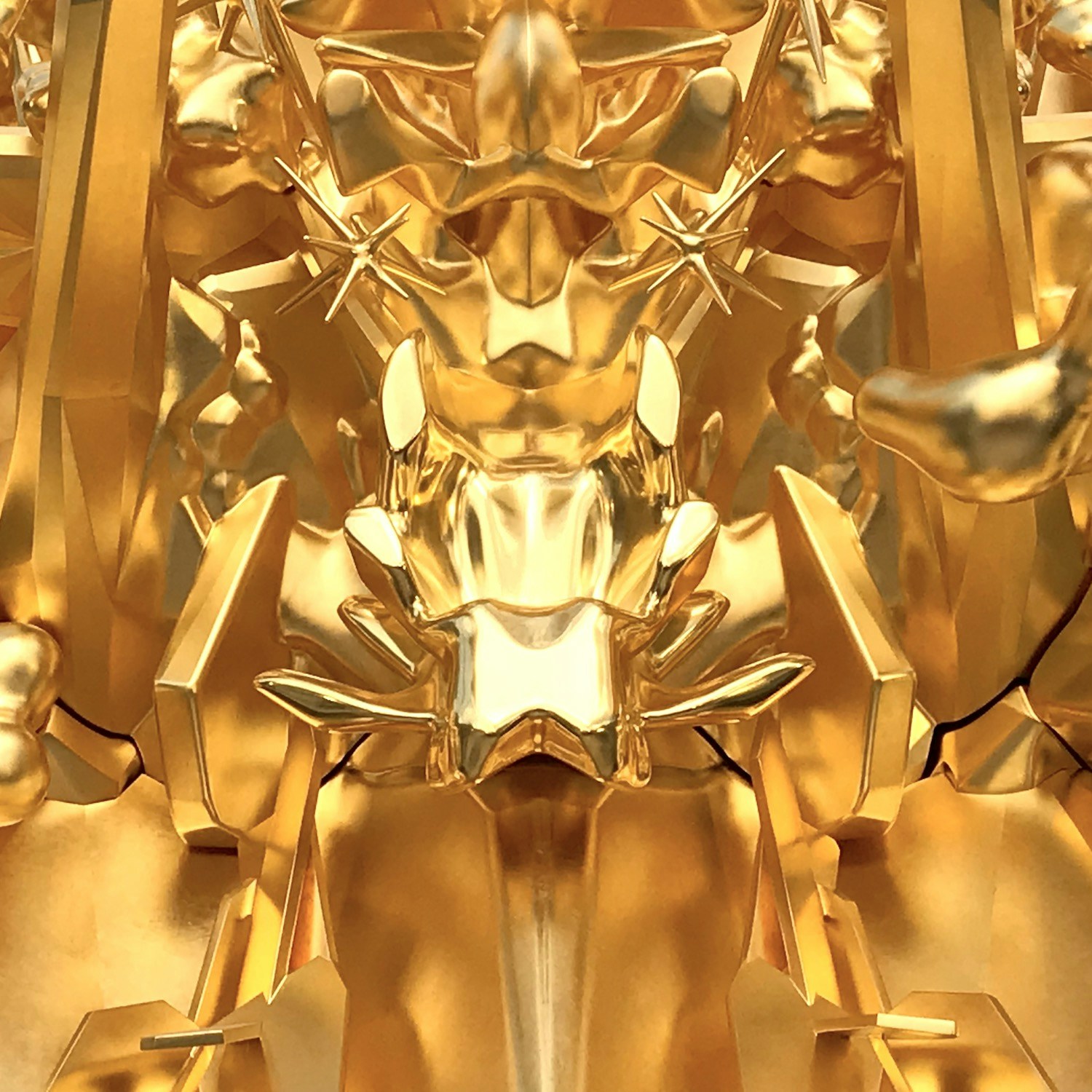 本作を覆う黄金は金沢でつくられ、京都の職人たちが手仕事で貼ったもの。30のパーツで構成される複雑な造形は、コンピューター上でデジタルクレイ(粘土)を用意し、その中で削り出されたものだという。「コンピュータの中でフィジカルに削った感覚を残しながらつくった」本作では、金箔というエジプトが起源とされる技術と、最新のテクノロジーが融合している。