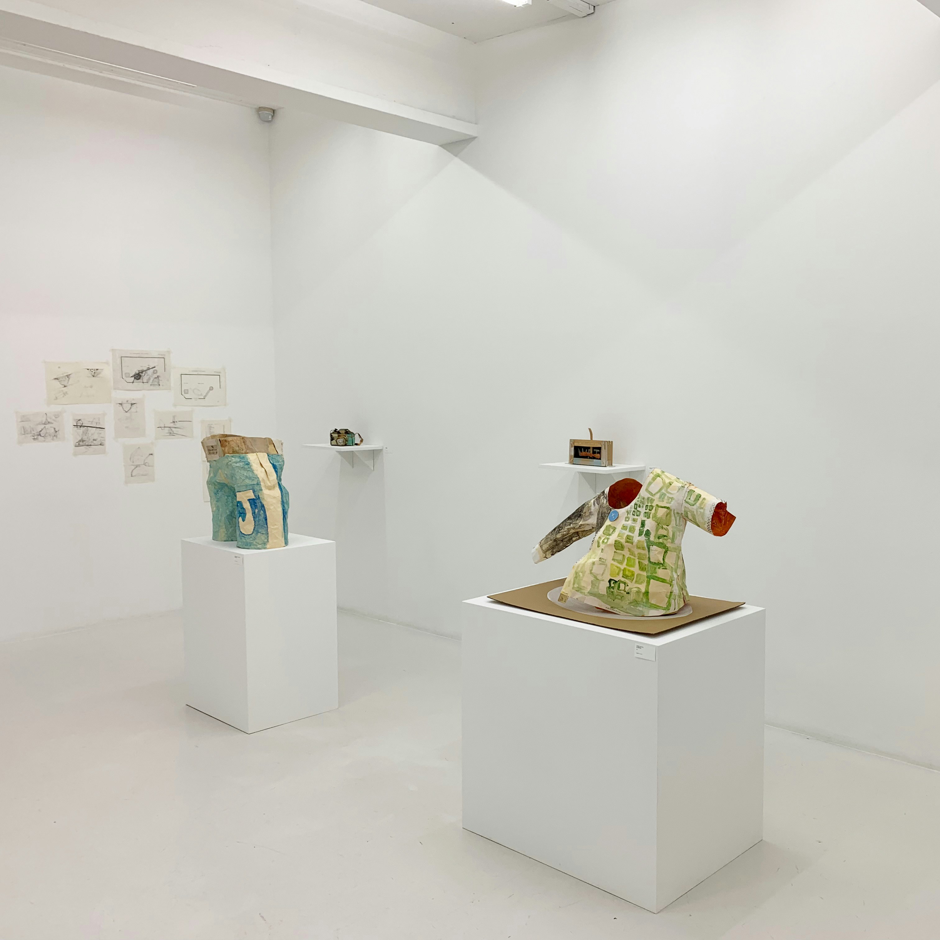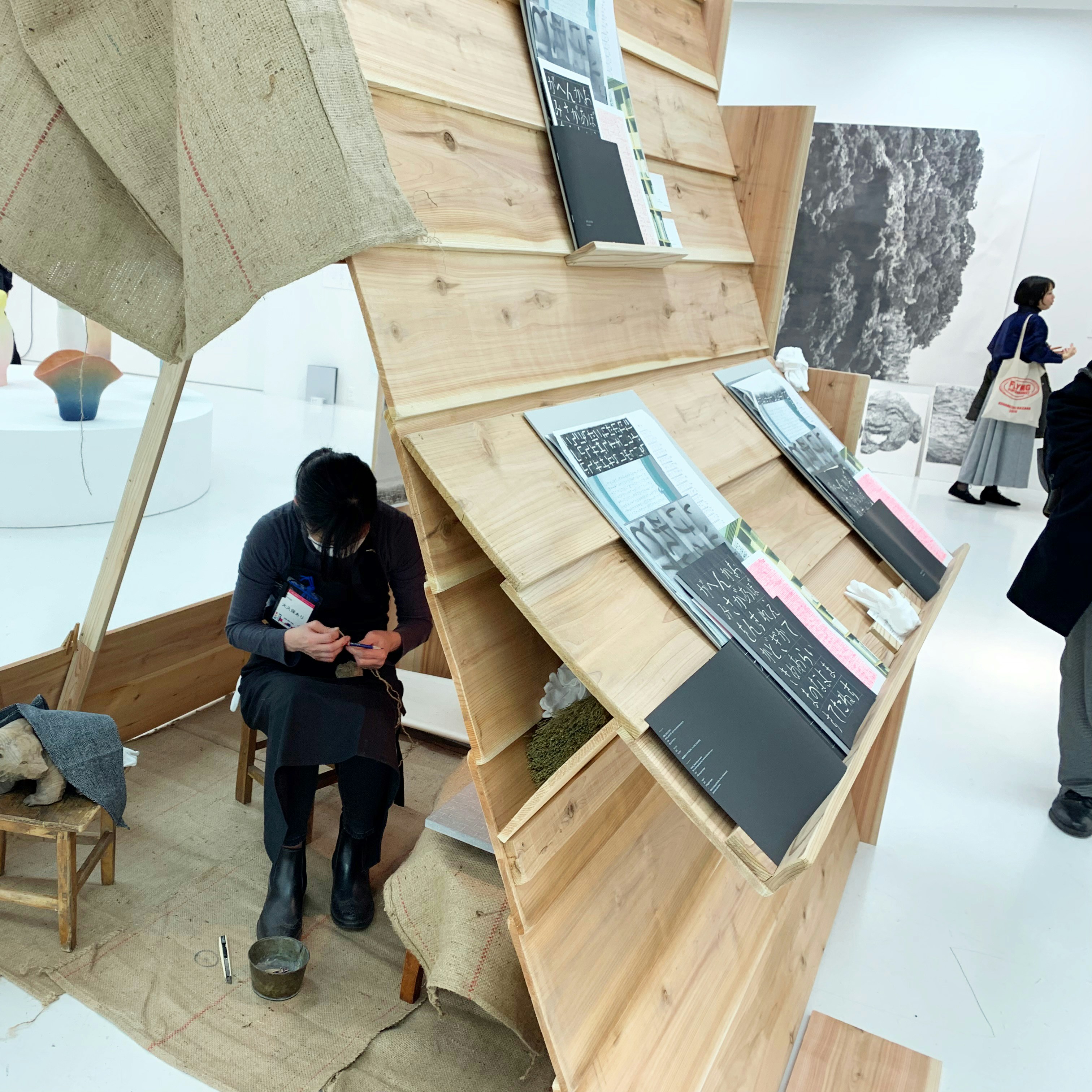 会期中は毎日会場で制作を行う大久保ありは、会場に「作業小屋」を出現させた。3月6〜9日は石板に文字を彫り、最終日の10日はそれを拓本にするというこの公開制作。スピードや正確さが重要視される「伝達」に、あえてエラーを引き起こす、大久保の作品シリーズ「あなたの美しい文字に心はありませんでした」の制作プロセスの一環をここでは見ることができる。