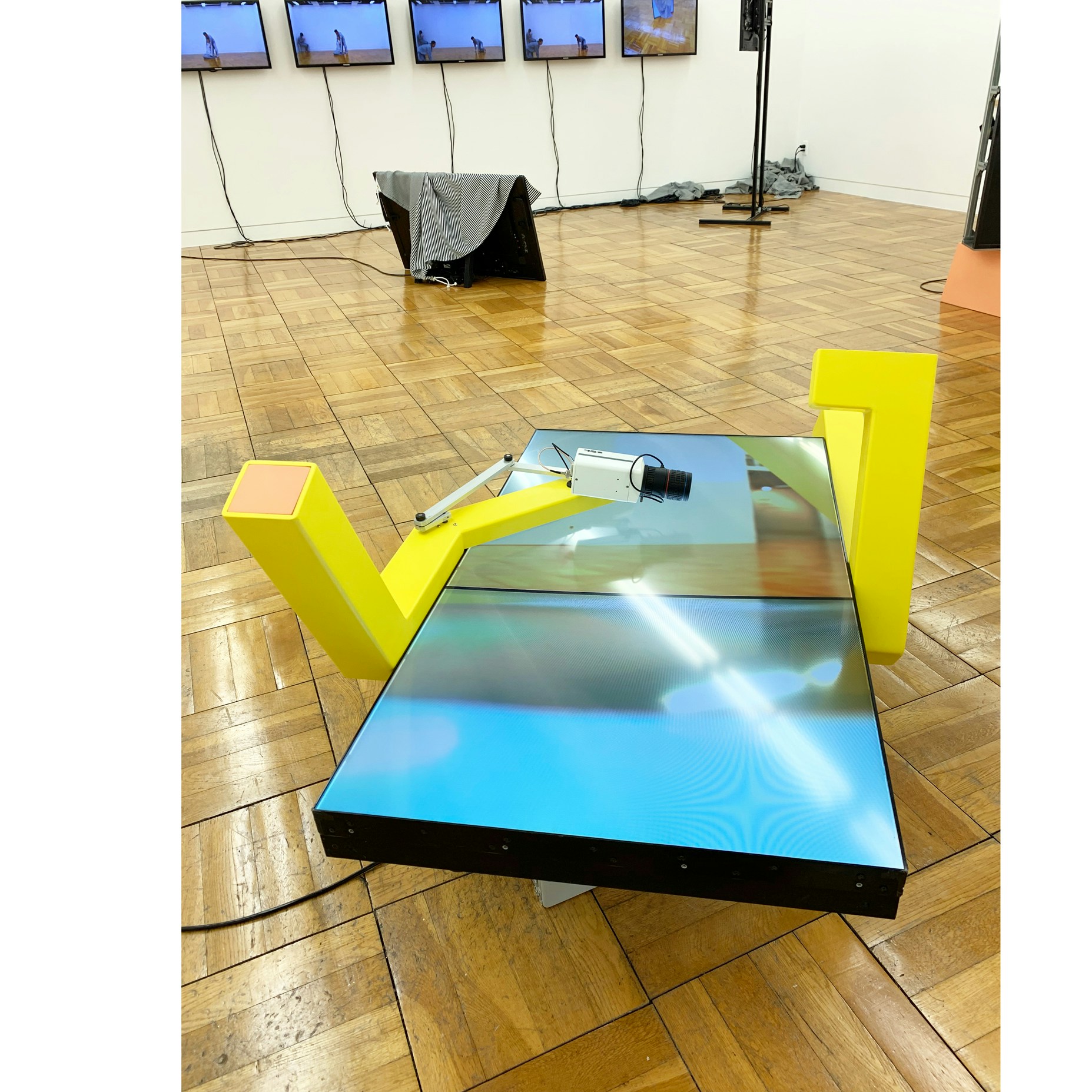 そして、その隣で上映されるのは、転がり落ちる巨大なとうもろこしを作家自身が受け止めるパフォーマンスを映像にした、栗原良彰の作品《コンパニオン》だ。広々とした屋上に足を踏み入れると、映像内で使用される装置、とうもろこしも展示されており、ユニークな光景をつくり出している。