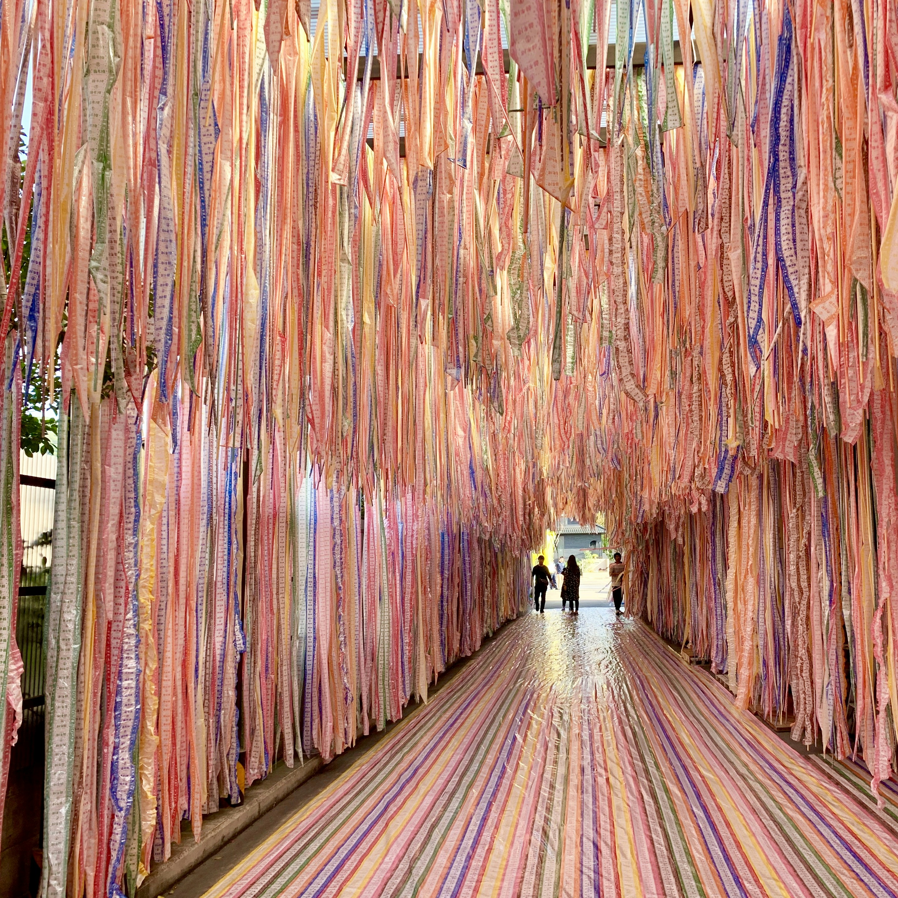 明治元年に創業した「別子飴本舗」。その7色の包装紙を使ったのが、松岡美江だ。別子飴は、住友財閥発展の礎となった別子銅山の名前を広めるため、その名前を冠した乳化飴製品。各地域に足を運び、その場所が持つ記憶と向き合った作品を手がけてきた松岡は今回、150年の歴史を持つ別子飴本舗とコラボレーションするにあたり、別子飴8万3000個分の包装紙でインスタレーション《タイムマンプ》を生み出した。新居浜を代表するモチーフが描かれた包装紙は80年間変わらないもの。床から天井までを覆った「包装紙のトンネル」は、別子銅山の坑道へのオマージュとなっている。