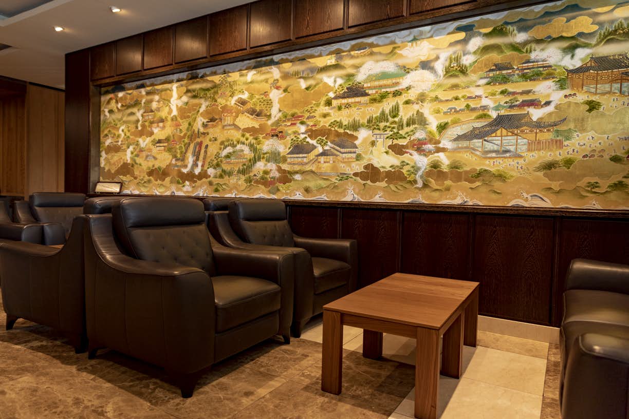 山荘 神和苑のフロント。左が東山魁夷の木版画《道》
