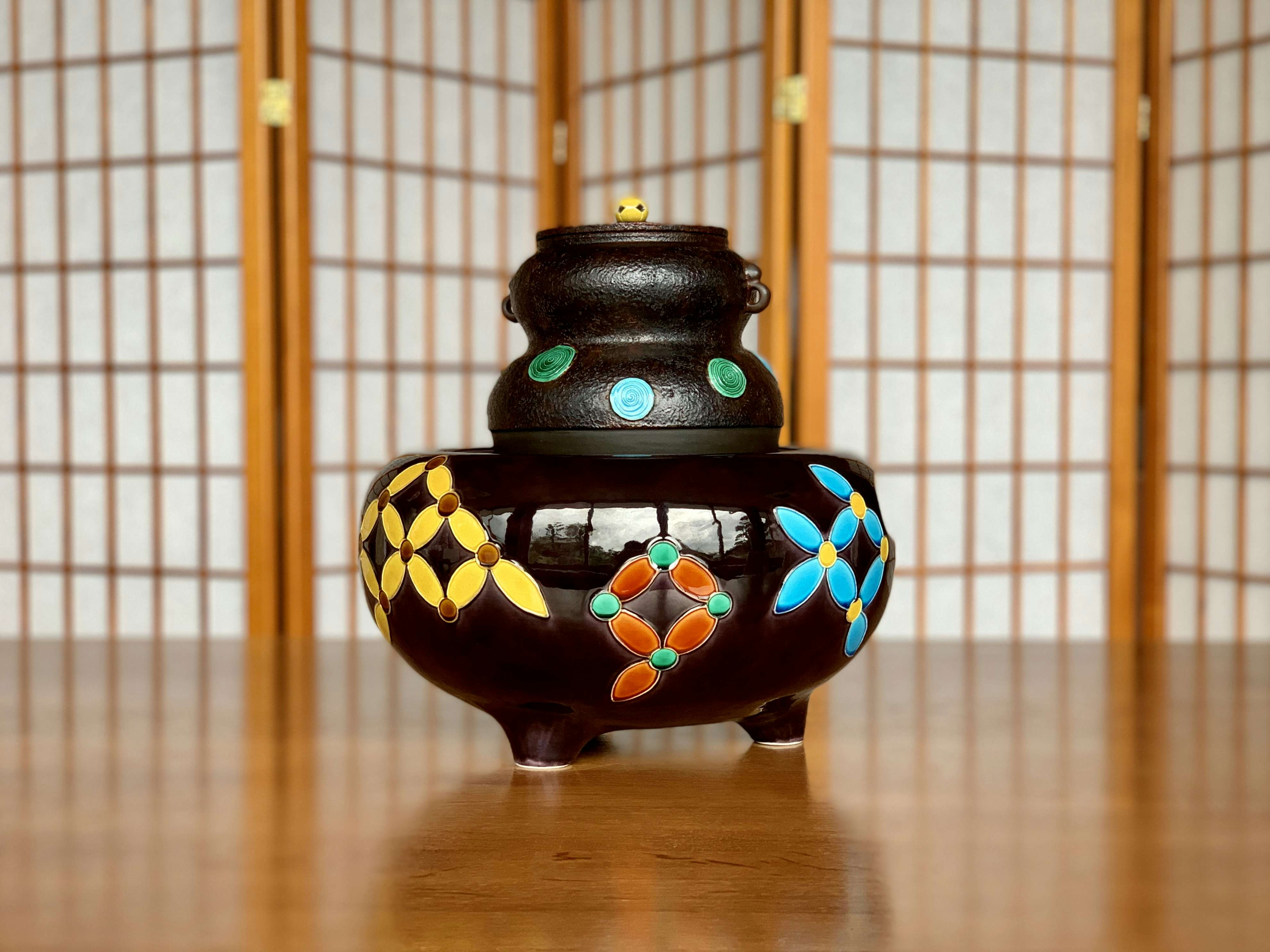 中村翠嵐の陶釜《交趾黄宝》と風炉《紫交趾七宝文》