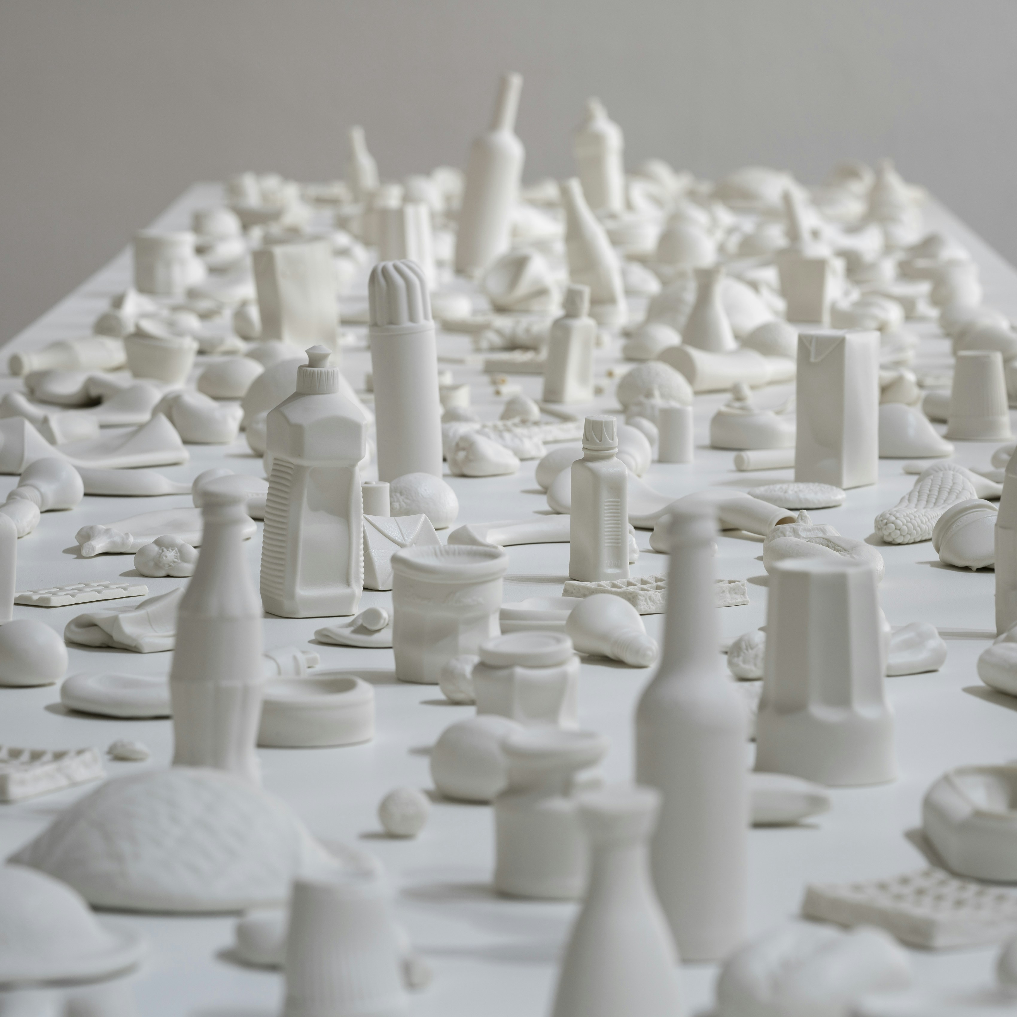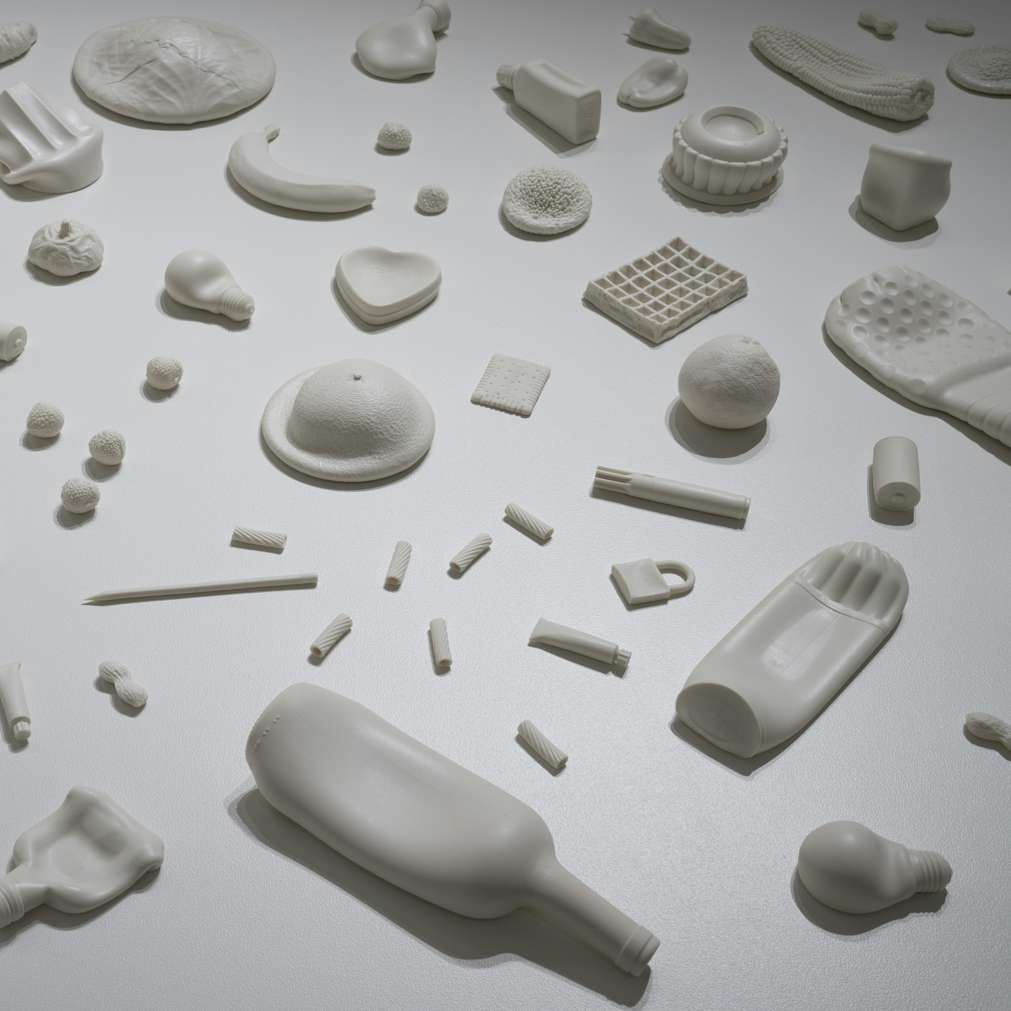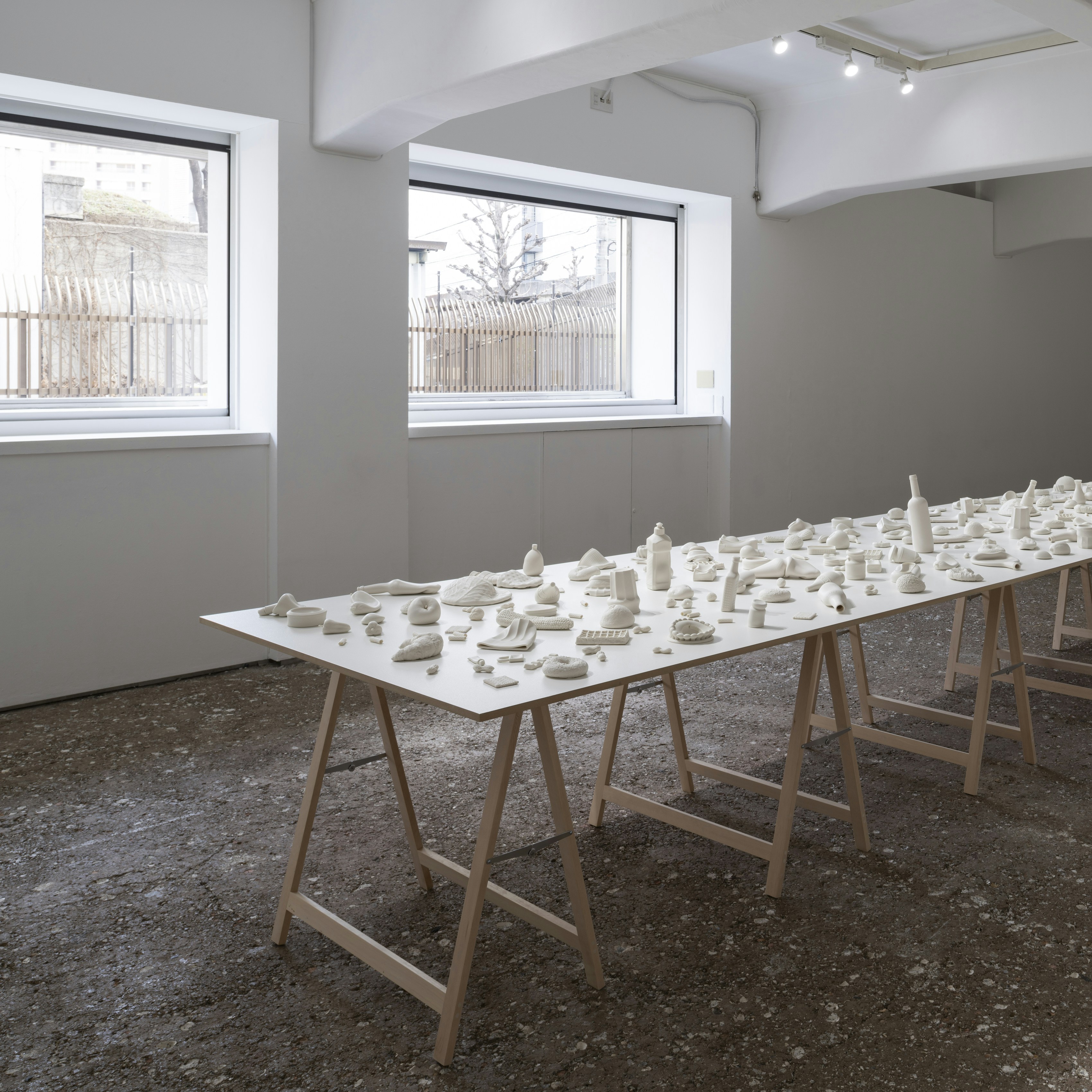 2007年にドイツに移住したアーティスト・デュオ、広瀬菜々&永谷一馬は、日用品などを変化させることで知覚を問いかける作品を制作。本展では、野菜や果物、コップなどを型取りした約300個の磁器からなるインスタレーション《Still life》を発表。磁器には、なんらかの力によって変形されたような凹みがあるが、それは磁器の配合を調整し、焼成するときの熱に反応して自然に生じた歪みだ。