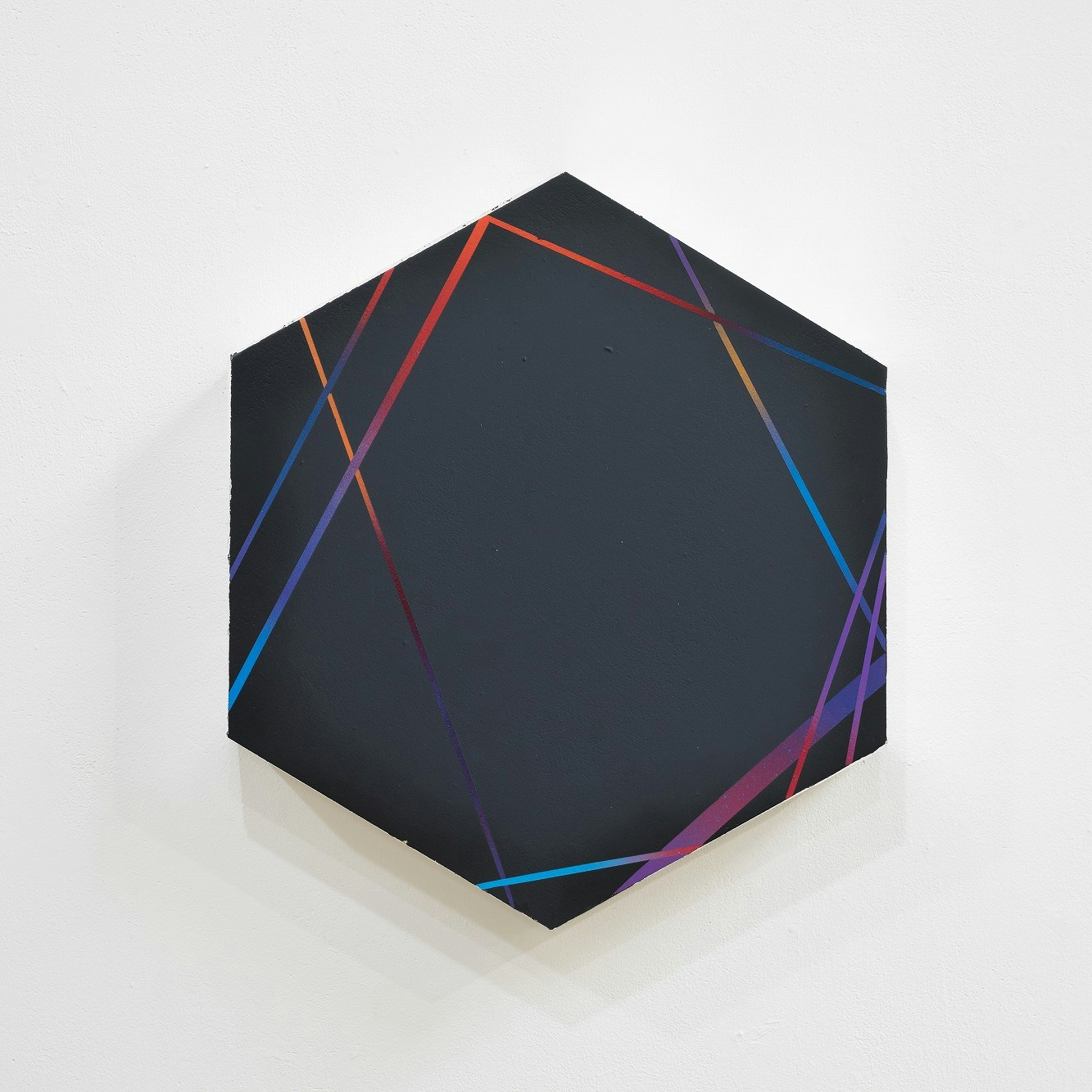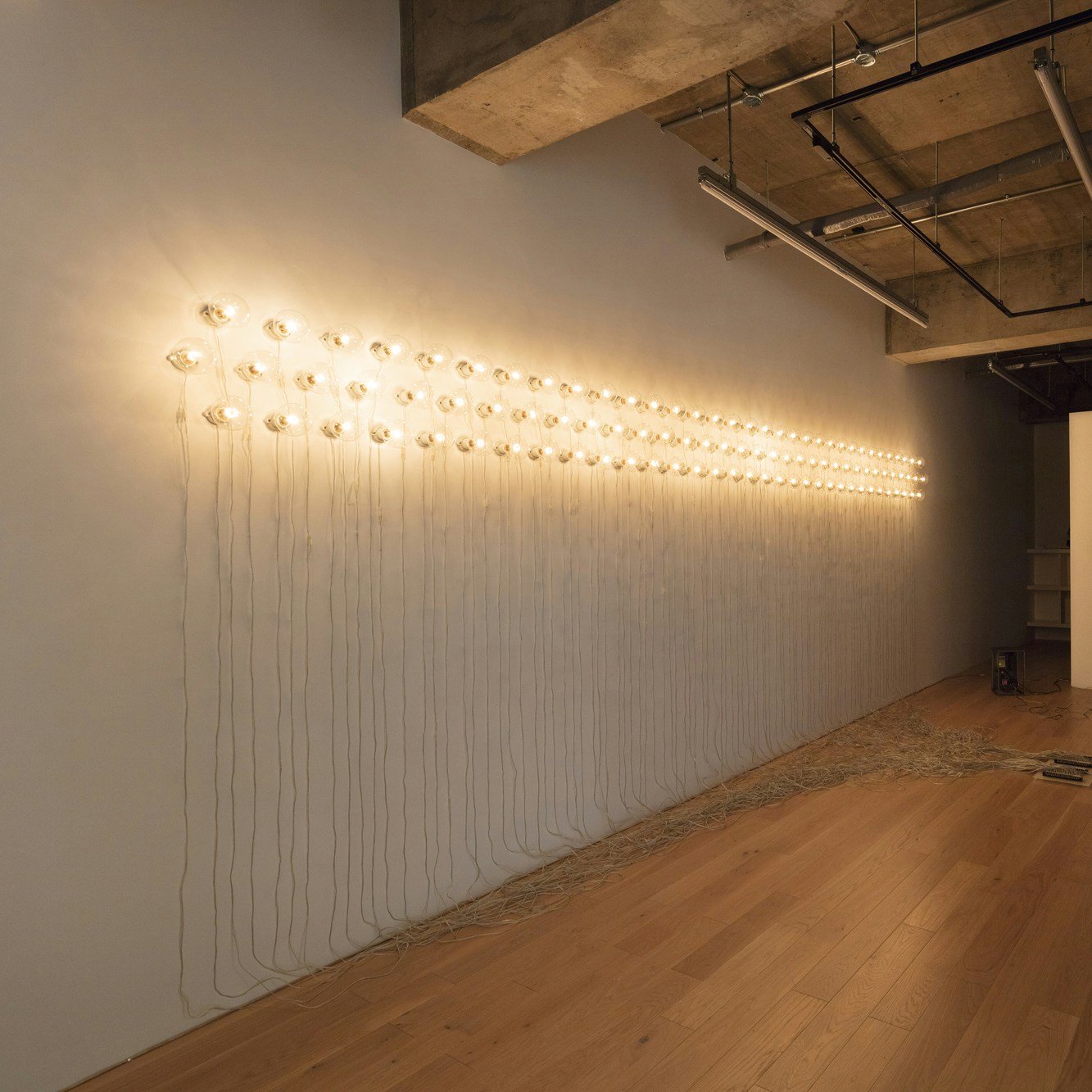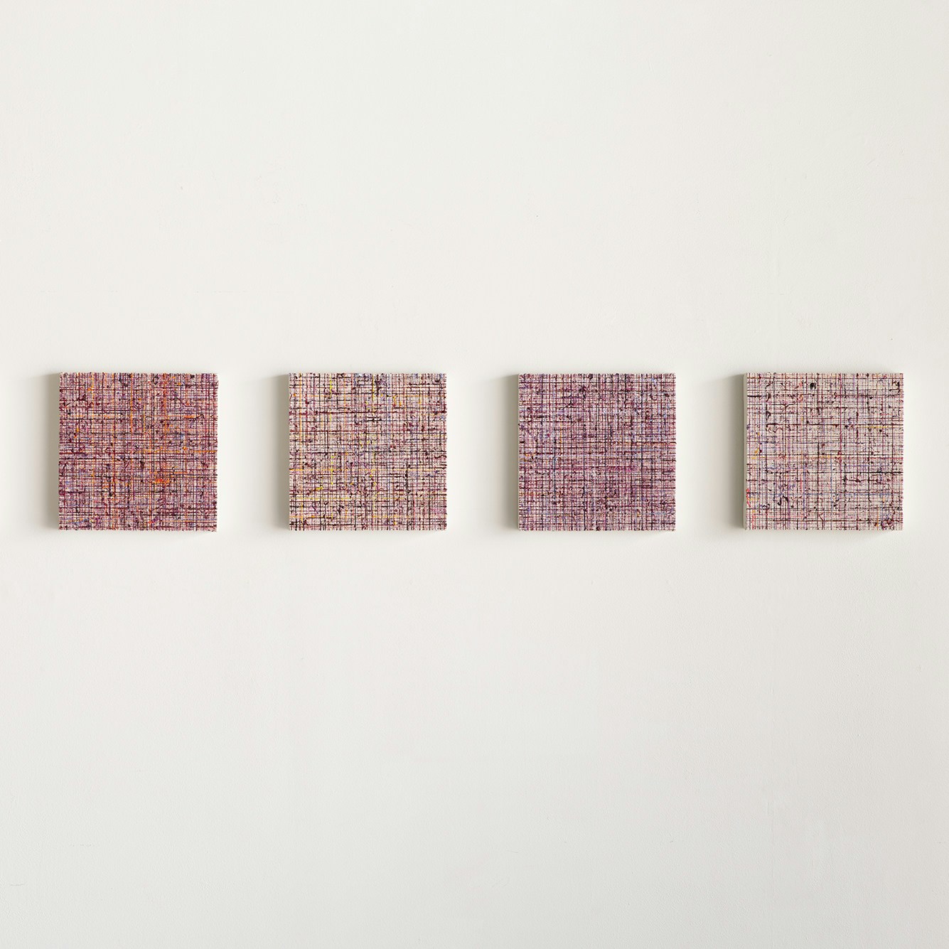 またGALLERY 麟では、油彩をほどこした糸をキャンバス上に無数に弾き、平面を立体に仕上げていく技法で作品を制作することで知られる横溝美由紀の「line」シリーズの紫色系を展示する。限られた矩形のキャンバスには、糸の痕跡が複雑に絡まり合い、次第に新たな空間を浮かびあがらせる。