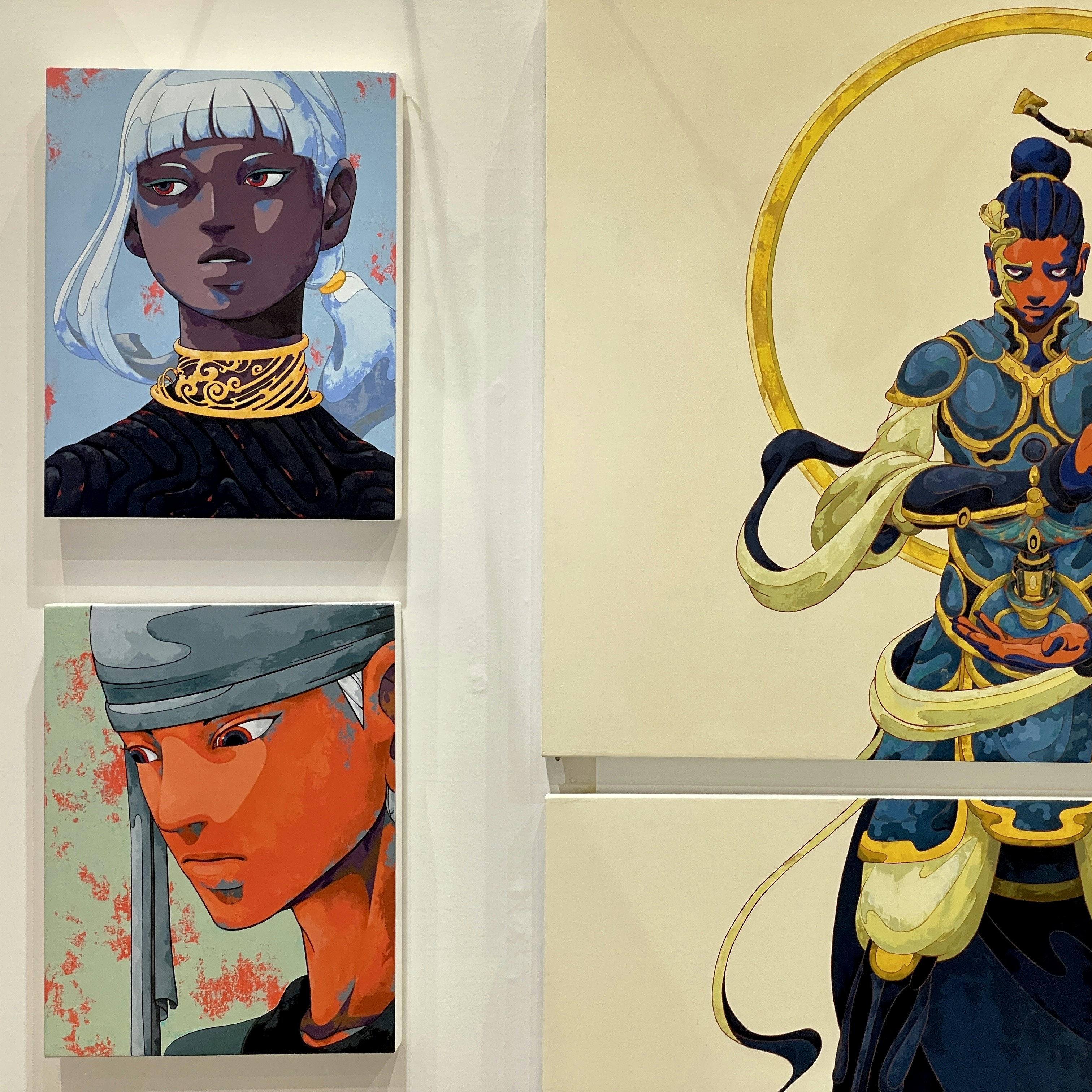 昨年のUNKNOWN ASIAでオーディエンス賞を受賞した山中智郎。デジタルアートを得意とする山中は、毘沙門天などの仏教的な題材を「ヒーロー」の原型としてとらえ、自らの憧れをそこに託す。本展では、デジタル作品をもとにしつつ、キャンバスへと落とし込んだ作品を発表した。