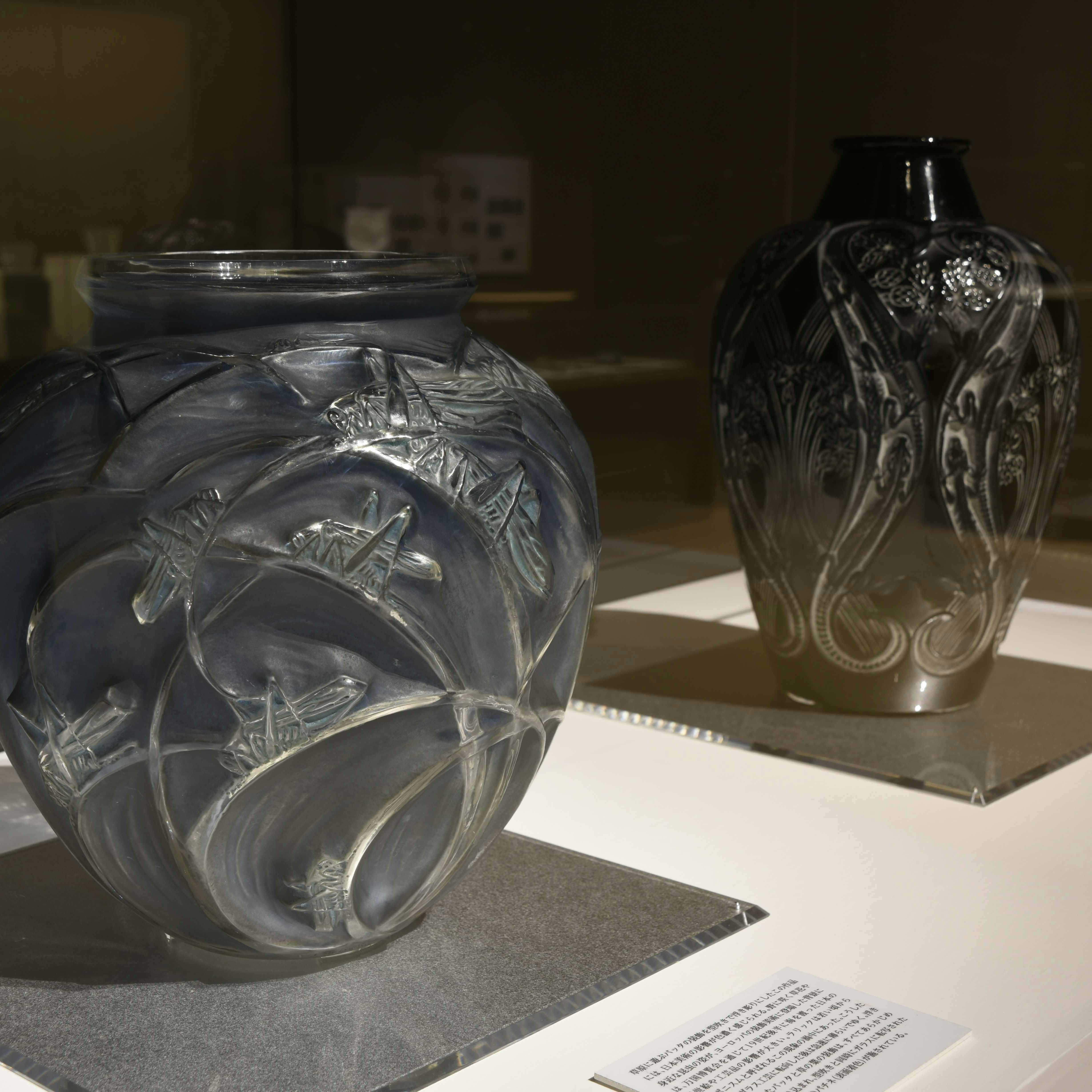 次の展示室に進むと、ラリックの真骨頂であるデザインの変遷が、50点以上の作品によって年代順に紹介されている。日常生活に潤いをもたらすためにつくられた各作品はガラスケースの展示台に置かれており、ラリックの独創性が垣間見える造形を、様々な角度から見ることができる。例えば、ジャポニスムの影響を受けた花瓶などは、バッタと夏草といった日本的なモチーフが取り入れられており、バラエティー豊かな意匠の楽しさを感じることができるだろう。