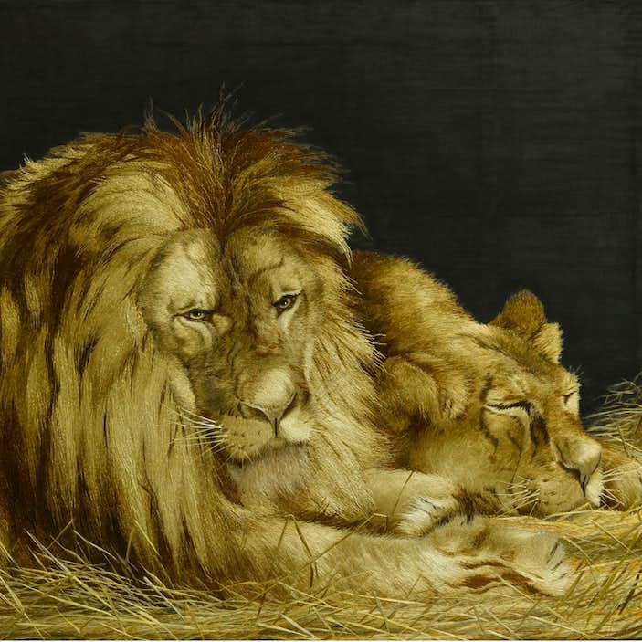 本展では、髙島屋史料館や清水三年坂美術館、千總、青木刺繍などが所蔵する数々の刺繍絵画や関連資料を紹介。とくに、髙島屋が明治から大正にかけて欧米に向け輸出し、100年を超えて日本へ里帰りした刺繍絵画《獅子図》が、画家・図案家として名高い神坂雪佳の弟である日本画家・神坂松濤が描いた下絵とともに展示される。