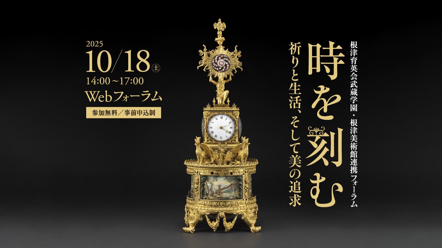 武蔵大学と武蔵高等学校中学校を運営する根津育英会武蔵学園が、根津美術館の特別協力のもと、「時計」をテーマとするフォーラム「時を刻む 祈りと生活、そして美の追求」を10月18日にライブ配信にて開催する。