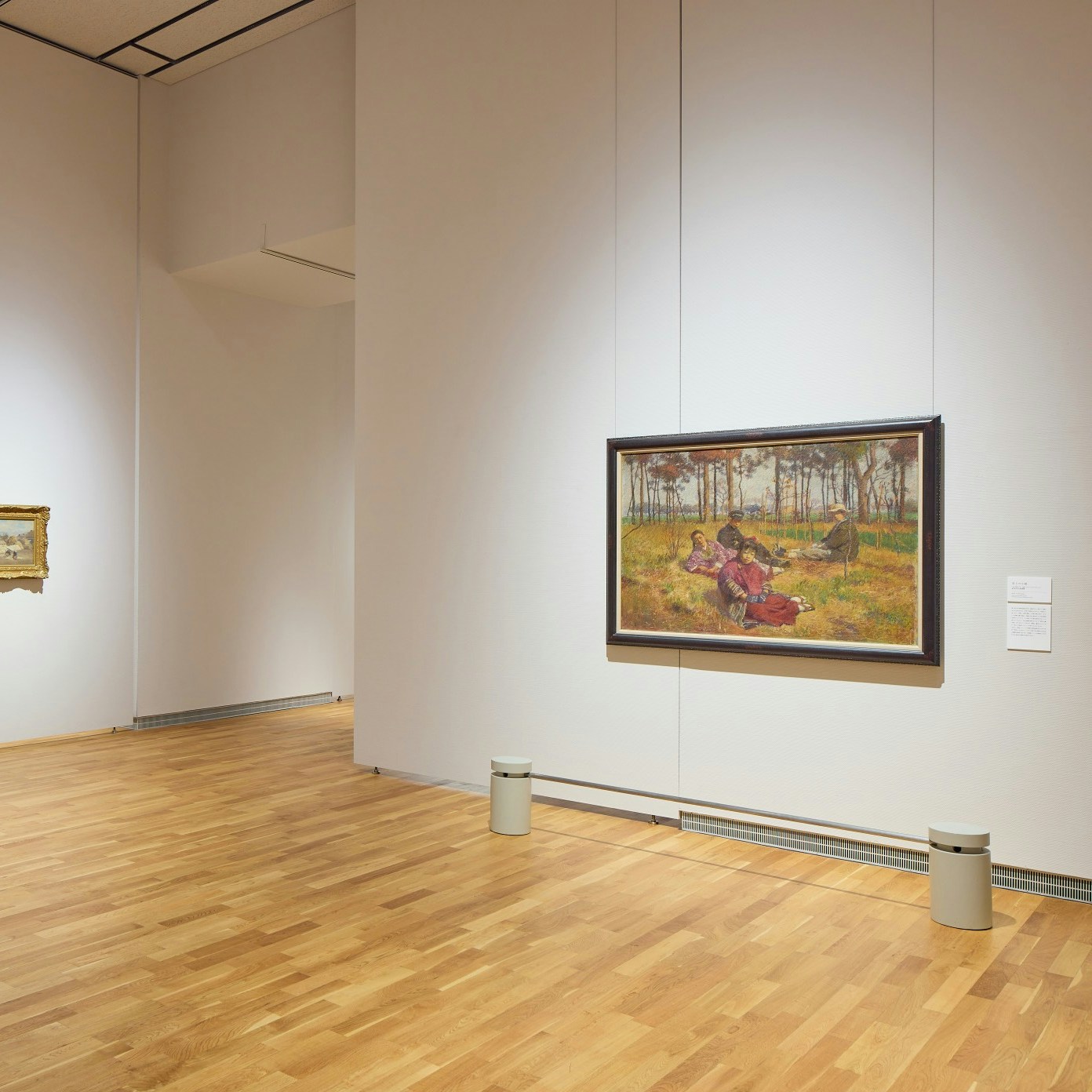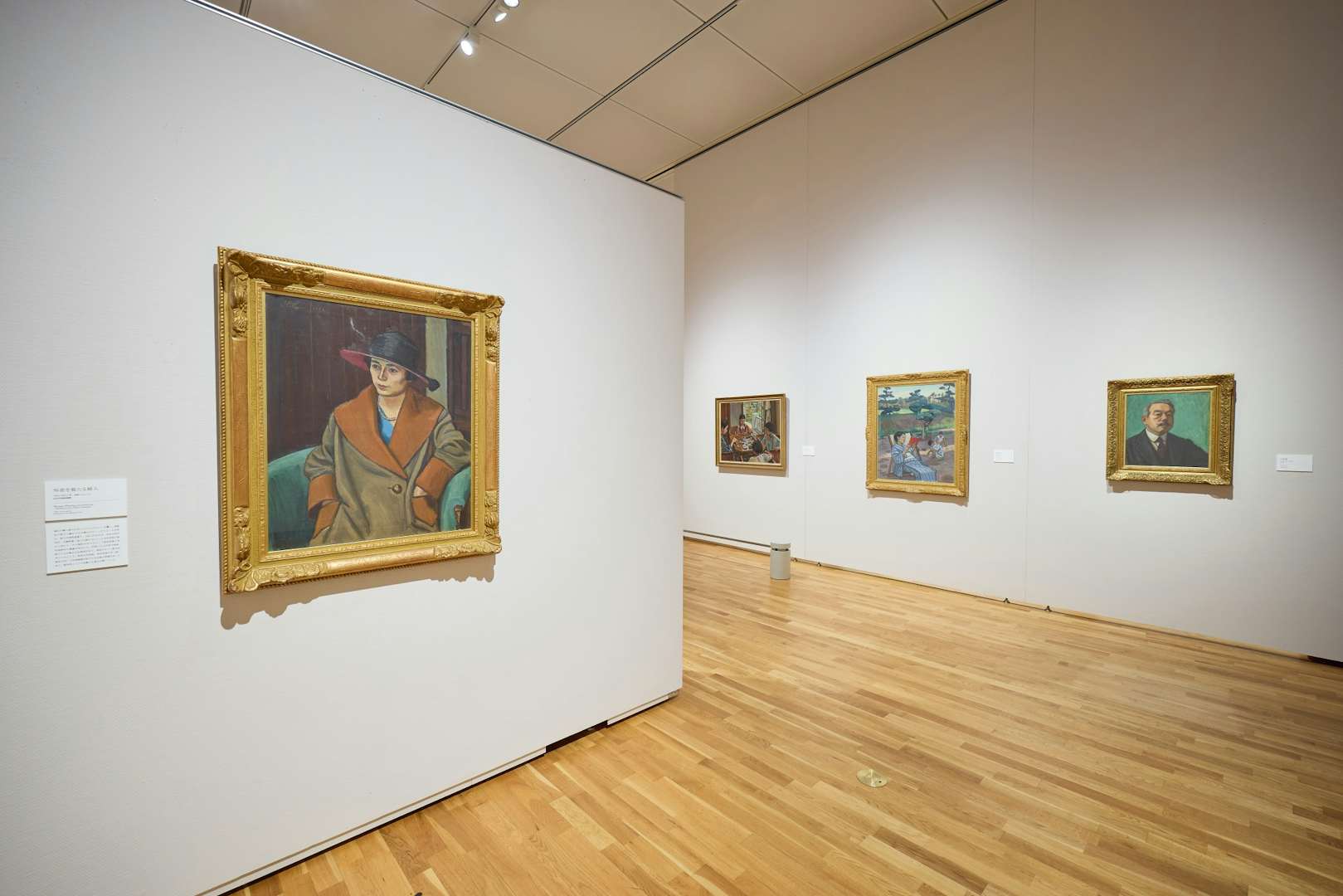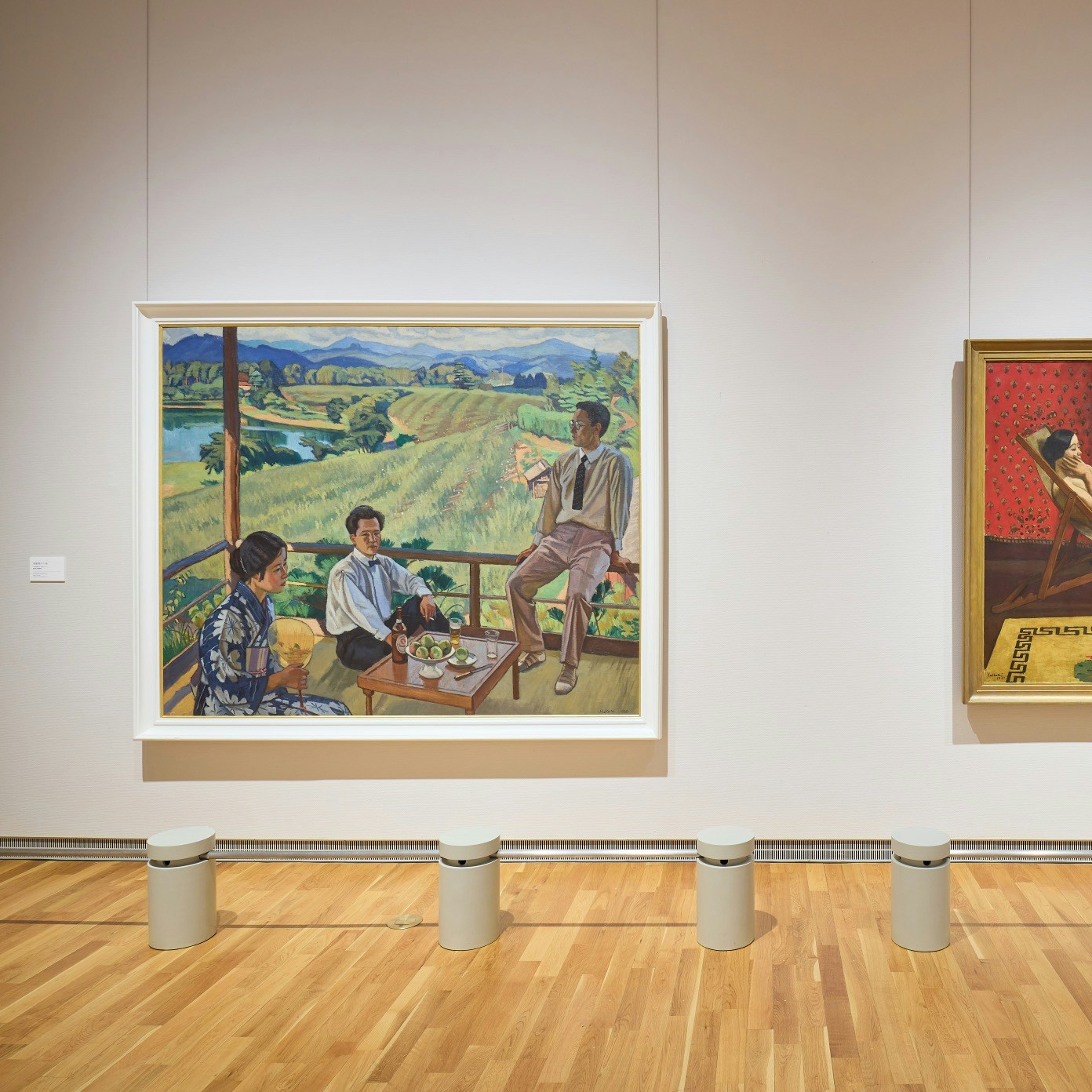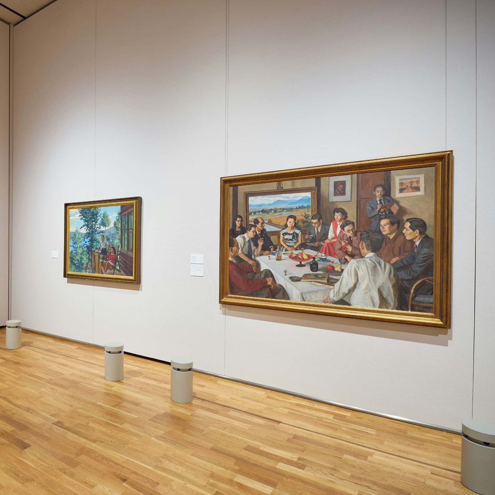 会場には、本展における最大級サイズの作品《画室》が紹介されている。本作は第17回二科展出品作だが、この作品のなかには柏亭が第15回二科展に出品した《果樹園の午後》(福島県立美術館蔵)が描かれている。80年以上ものあいだ個人蔵となっていた本作だが、京都国立近代美術館に所蔵され、今回は所蔵後、他館への貸し出しははじめてとなる貴重なお披露目の機会となっている。2作品が並ぶように展示されており、比較しながら鑑賞することができる。