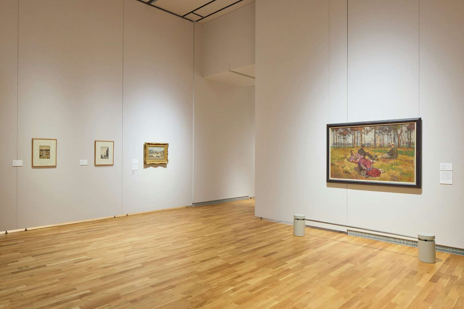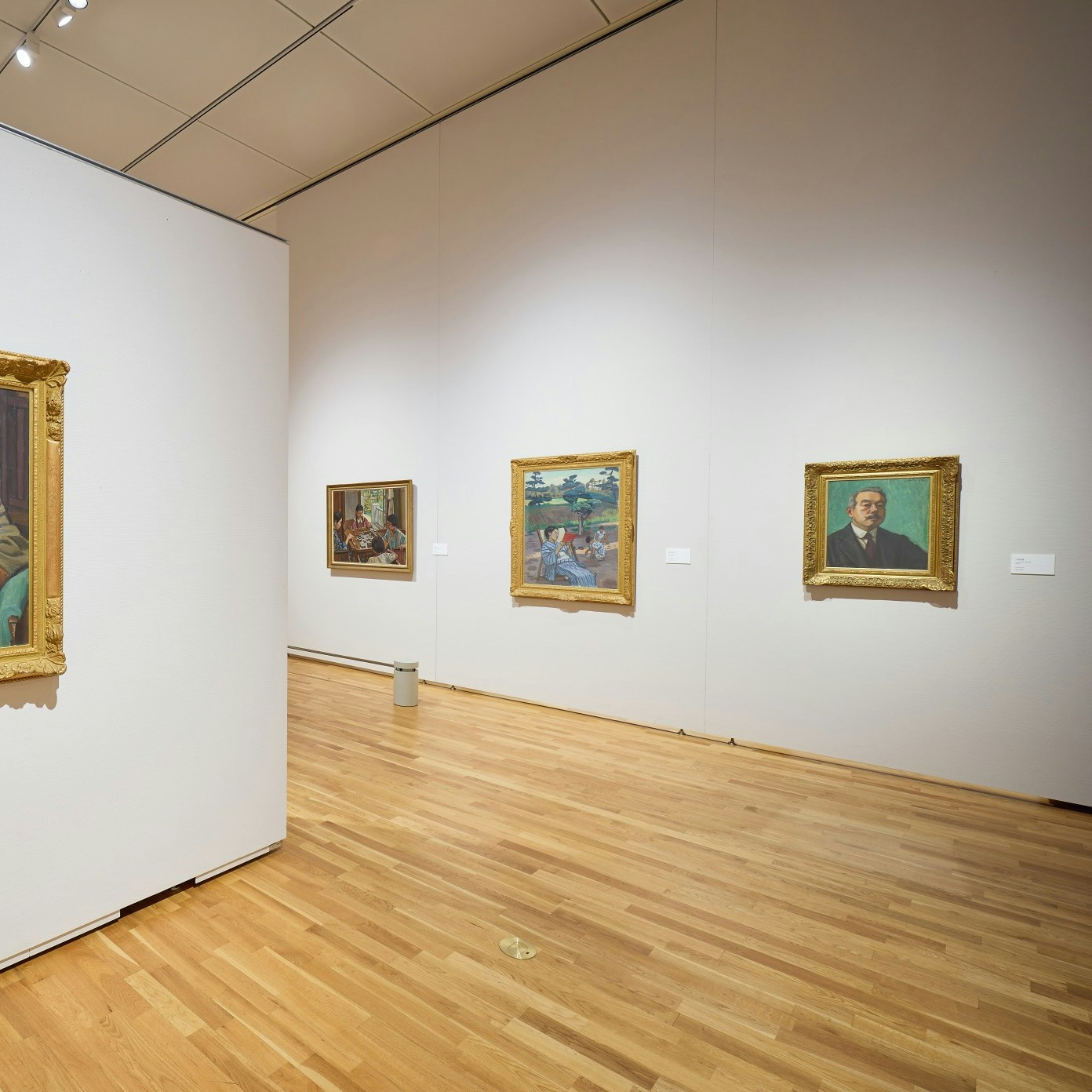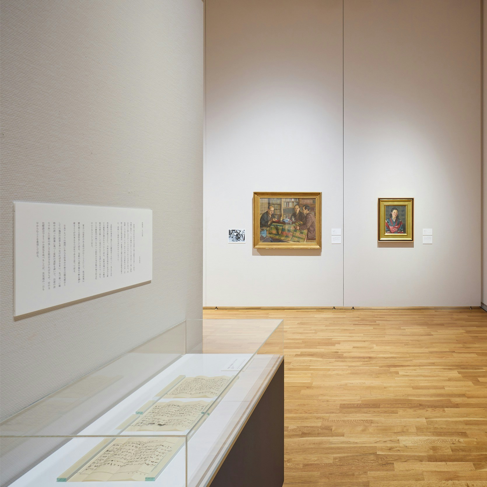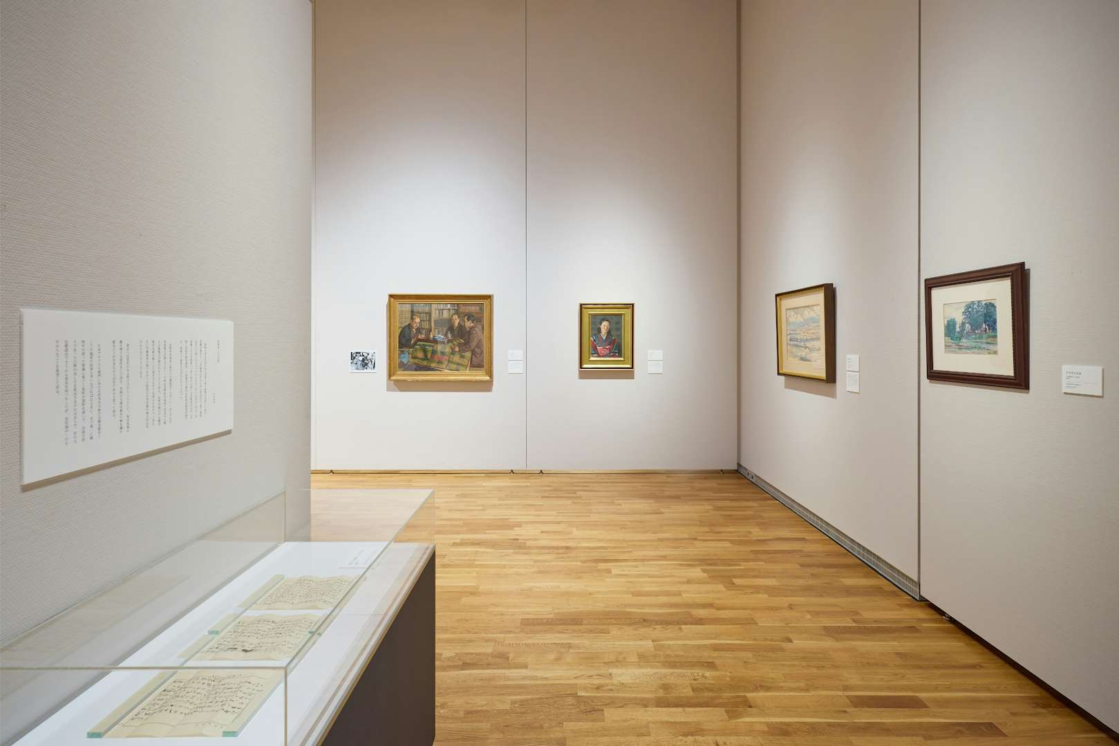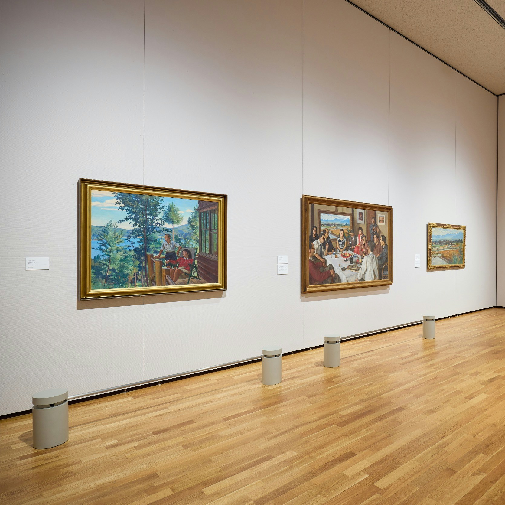 会場には、本展における最大級サイズの作品《画室》が紹介されている。本作は第17回二科展出品作だが、この作品のなかには柏亭が第15回二科展に出品した《果樹園の午後》(福島県立美術館蔵)が描かれている。80年以上ものあいだ個人蔵となっていた本作だが、京都国立近代美術館に所蔵され、今回は所蔵後、他館への貸し出しははじめてとなる貴重なお披露目の機会となっている。2作品が並ぶように展示されており、比較しながら鑑賞することができる。