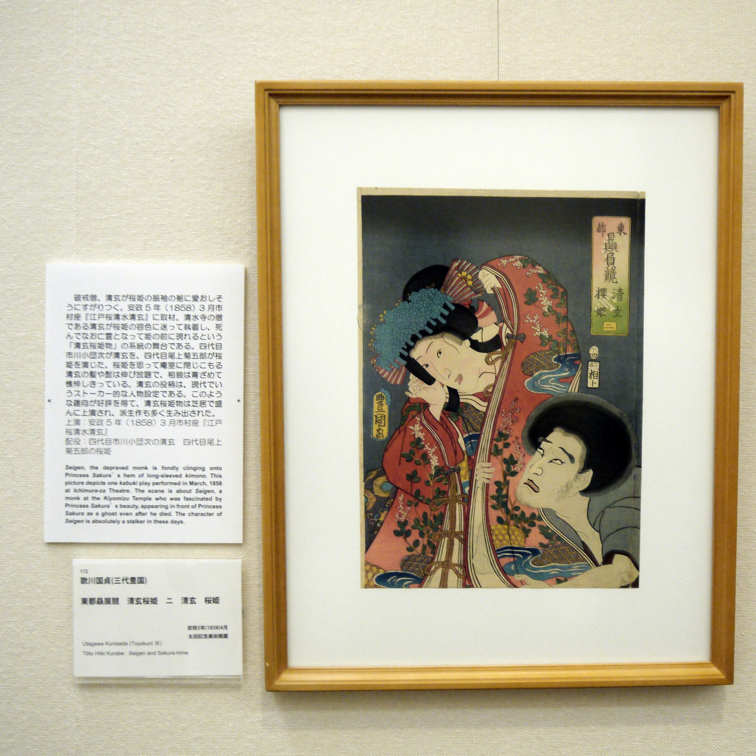 例えば、歌川国貞(三代豊国)の《東都贔屓競 二 清玄桜姫》(1858)では、の破戒僧が恋い焦がれる桜姫の袖にすがりつくという歌舞伎・浄瑠璃の演目『清玄桜姫物』の光景が描かれている。現代のストーカーそのものの振る舞いをしながら、叶わぬ恋のために身を滅ぼす破戒僧を描いた同作は好評を得て、芝居で盛んに上映されたほか、派生作品も多く生み出されたという。
