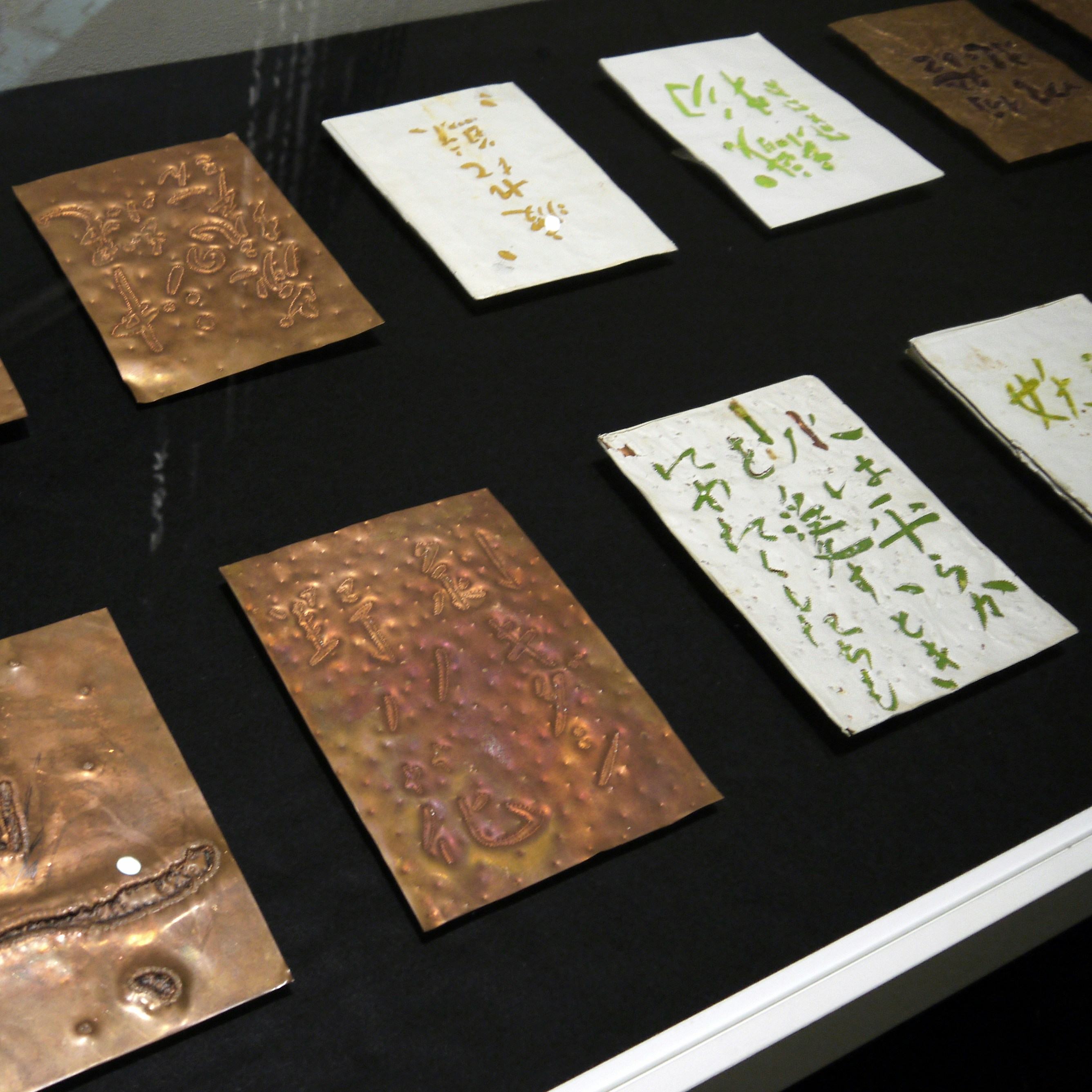 同章では、吉増による多数の直筆原稿のほか、90年代から制作されている銅板打刻作品シリーズなども展示されている。銅板打刻作品シリーズは、彫刻家・若林奮が用意した銅板に、吉増がハンマーと鑽による彫金で文字や言葉を刻んだもの。書跡を立体的におこした同シリーズにおいて、吉増は無機的で硬質な銅板を、触覚的で独特な質感に変化させることに成功している。その制作は、2003年に若林が没したいまもなお続行されており、その制作態度からは吉増の「手で言葉を記す」という行為そのものへの追求がうかがえる。